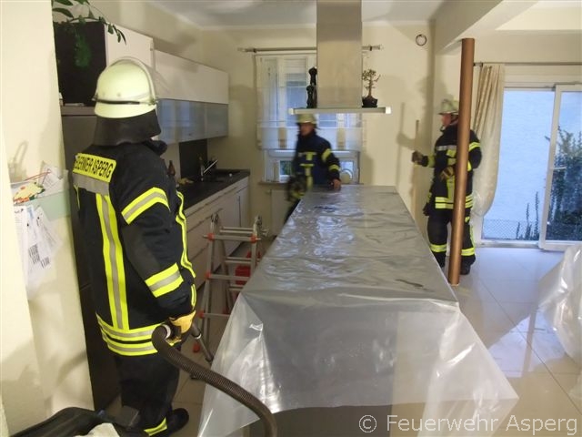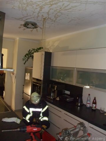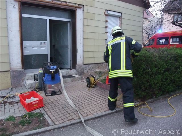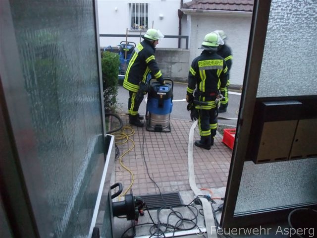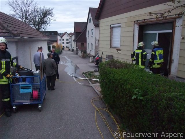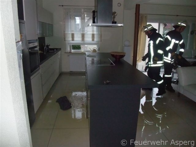 Am Ostermontag wurde die Feuerwehr Asperg zu einem Wasserrohrbruch in die Lehenstraße alarmiert. Über Notruf 112 meldete ein Bewohner eines Zweifamilienhauses massiven Wassereinbruch in seiner Erdgeschoßwohnung. In der im 1. Obergeschoss leerstehenden Wohnung kam es in der Küche zu einem Wasserrohrbuch. Umgehend wurde das Wasser durch die Einsatzkräfte der Feuerwehr abgestellt und das komplette Haus stromlos geschaltet. Eine externe Stromversorgung wurde mit einem Stromaggregat aufgebaut und das Wasser mittels mehreren Wassersaugern aufgenommen. Teile der Wohnungseinrichtung wurden zum Schutz vor dem aus der Decke tropfenden Wasser mit Planen abgedeckt. Eine Installationsfirma wurde verständigt. Ebenfalls vor Ort war die Polizei mit einer Streife.