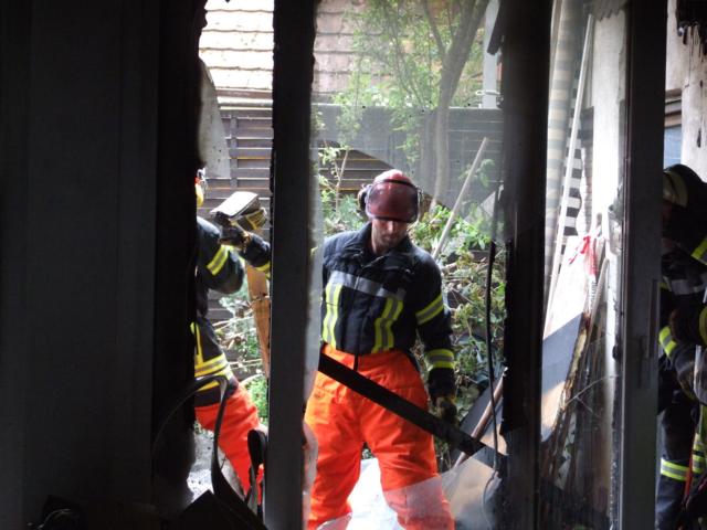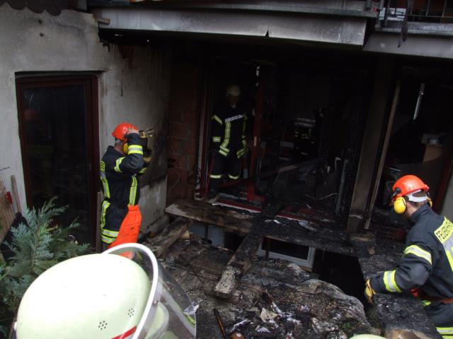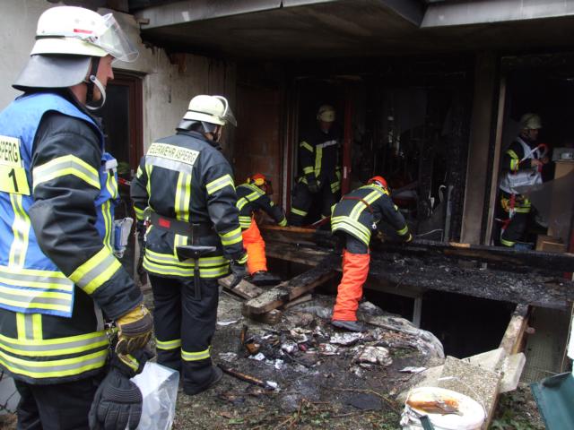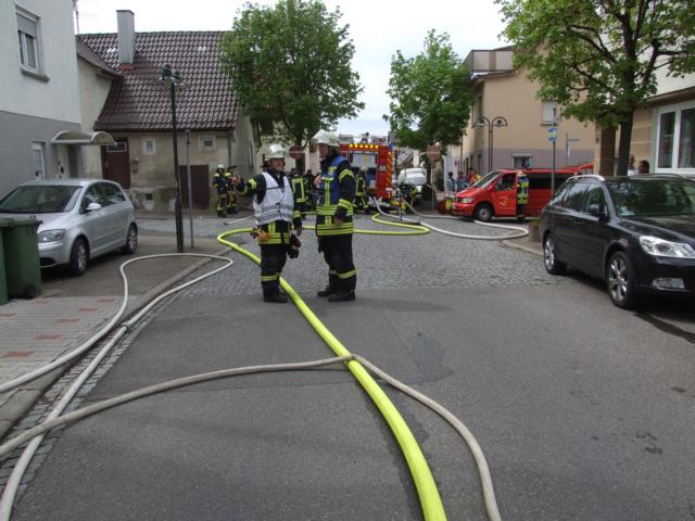 Am Sonntag wurde die Feuerwehr Asperg zu einem Wohnungsbrand in die Schillerstraße alarmiert. Ebenfalls wurde gemäß Alarm- und Ausrückeordnung die Feuerwehr Möglingen in Löschzugstärke und die Feuerwehr Ludwigsburg mit der Drehleiter mitalarmiert. Bereits drei Minuten nach der Alarmierung rückte die Feuerwehr Asperg mit zwei Fahrzeugen zum Brandort aus. Eine Rauchentwicklung war bereits auf der Anfahrt sichtbar. Beim Eintreffen der ersten Einsatzkräfte bestätigte sich die Meldung. Die Terrasse und Wohnräume einer Erdgeschosswohnung eines Dreifamilienhauses standen bereits im Vollbrand. Umgehend wurde mit der Brandbekämpfung mittels 2 C-Rohren durch zwei Trupps unter schwerem Atemschutz begonnen. Da unklar war ob sich noch Personen in dem Gebäude befanden gingen sofort zwei weitere Trupps unter schwerem Atemschutz zur Menschenrettung in das Gebäude vor. Es stellte sich jedoch zum Glück heraus, dass sich niemand mehr in dem Gebäude befand. Die Drehleiter der Feuerwehr Ludwigsburg wurde mit einem Wenderohr zur Absicherung in Stellung gebracht. Auf der rückwärtigen Gebäudeseite wurde mit einem dritten C-Rohr begonnen einen Flammenüberschlag in das 1.Obergeschoss zu verhindern. Hier kam auch eine Steckleiter zum Einsatz über diese die Einsatzkräfte in die über der Brandwohnung liegenden Wohnung gelangten. Nach einem rund 30 Minuten dauernden Löschangriff konnte „Feuer aus“ gemeldet werden. Umfangreiche Nachlöscharbeiten waren jedoch nötig. Hier kamen zum Auffinden von Glutnestern zwei Wärmebildkameras zum Einsatz. Durch die Einsatzkräfte der Feuerwehr musste die verbrannte Holzterrasse sowie eine Teil der Hausverkleidung mittels Motorkettensäge entfernt werden. Ein Bild von der Einsatzstelle vor Ort machte sich auch der stellvertretende Kreisbrandmeister Jochen Feierabend. Die Polizei leitete Ermittlungen zum Brandhergang ein. Ebenfalls vor Ort war der Rettungsdienst mit mehreren Fahrzeugen. Während des Einsatzes musste die Schillerstraße voll gesperrt werden.