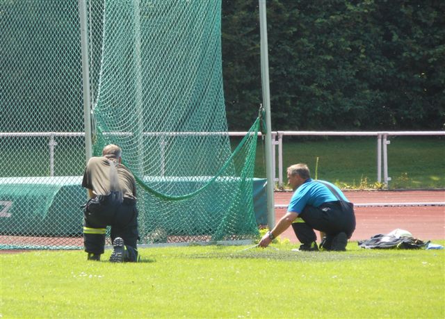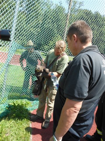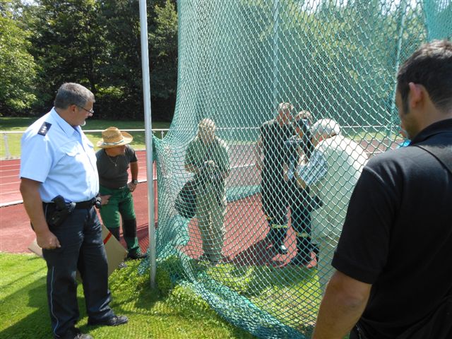 Am Dienstag wurde die Feuerwehr Asperg im Rahmen einer Amtshilfe vom städtischen Ordnungsamt alarmiert. Passanten und der Hausmeister des Stadions meldeten einen verletzten und flugunfähigen großen Raubvogel im Bereich der Sportanlagen. Laut den Zeugen, sollte es sich vermutlich um einen jungen Adler handeln. Die Einsatzkräfte der Feuerwehr Asperg dursuchten das angrenzende Waldstück nach dem verletzten Raubvogel. Parallel wurde durch die Feuerwehr Asperg Kontakt zu den Greifvogelwarten in Baden-Württemberg aufgenommen. Hier wurde abgeklärt, ob ein Greifvogel abgängig ist. Da nicht abschließend geklärt werden konnte, ob tatsächlich ein Adler abgängig ist, wurde ein "Greifvogelwart" zum Einsatzort angefordert. Im Bereich der Diskuswurfanlage auf dem Stadiongelände wurde die Feuerwehr Asperg dann fündig. Der Greifvogel war aufgrund einer Verletzung am Flügel tatsächlich flugunfähig. Mittels der bei der Feuerwehr Asperg vorgehaltenen speziellen Tierfangeräte, konnte das Tier bis zum Eintreffen des Greifvogelwarts eingefangen werden. Es wurde zudem von den Einsatzkräften vor der enormen Hitze mit Wasser gekühlt. Der Vogel stellte sich nach Begutachtung durch den Greifvogelwart nicht als Adler, sonder als großer Mäusebussard heraus. Der verletzte Mäusebussard wurde unter die Obhut des Greifvogelwarts genommen. Vor Ort waren auch das städtische Ordnungsamt und eine Streife der Polizei.