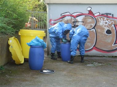 Am Dienstagmorgen wurde die Feuerwehr Asperg mit dem Gefahrstoffzug zu einem Chlorgasunfall im Rahmen der Überlandhilfe nach Ludwigsburg (Neckarweihingen) alarmiert. Techniker bemerkten beim Betreten des Technikraumes im Lehrschwimmbecken in der Carl-Diem-Straße (LB) stechenden Chlorgeruch und verständigten umgehend über Notruf 112 die Feuerwehr. Ein Techniker atmete hierbei die giftigen und ätzenden Dämpfe ein und musste zur stationären Behandlung vom Rettungsdienst ins Krankenhaus gebracht werden. Grund für den Chlorgasaustritt waren zwei aus bislang ungeklärter Ursache leck gewordene 35 kg Behälter mit Chlorbleichlauge. Unter schweren Chemikalienvollschutzanzügen gingen die Kräfte des Gefahrstoffzuges der Feuerwehr Asperg vor und dichteten die Behälter ab. Zudem wurden die Behälter anschließend in Überfässer umgelagert. Hier kamen insgesamt drei Trupps der Feuerwehr Asperg unter Chemikalienvollschutzanzügen zum Einsatz. Parallel zu den Sicherungsarbeiten wurden die Technikräume mittels Hochdrucklüfter belüftet und Luftmessungen durchgeführt. Hier kam ein Trupp unter Chemikalienvollschutzanzug der Feuerwehr Ludwigsburg zum Einsatz. Die in den Überfässern gesicherten defekten Behälter wurden von einem Fachunternehmen entsorgt. Die Polizei leitet Ermittlungen zum Unfallhergang ein