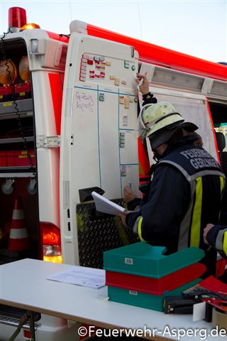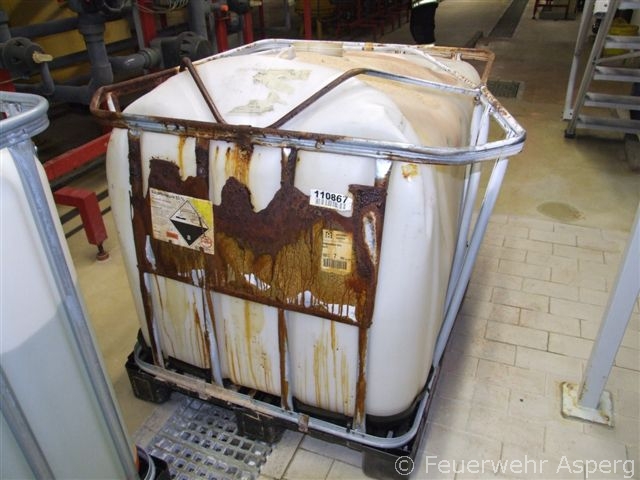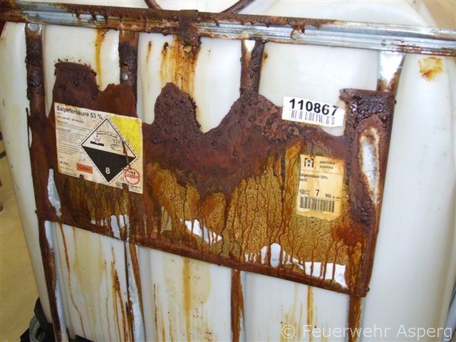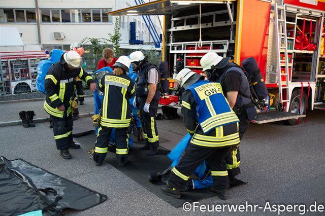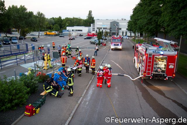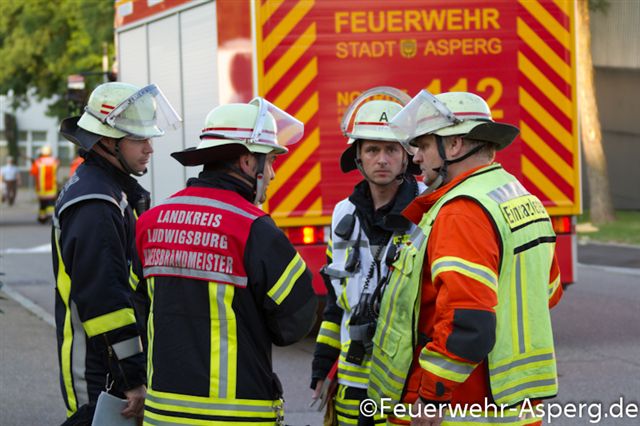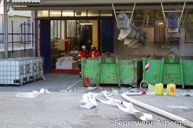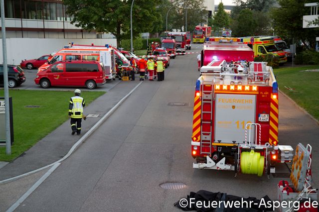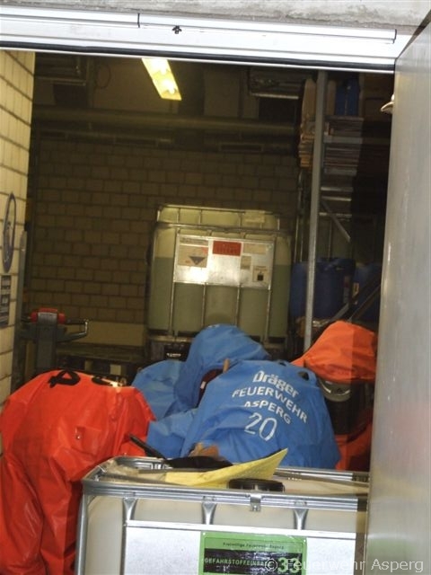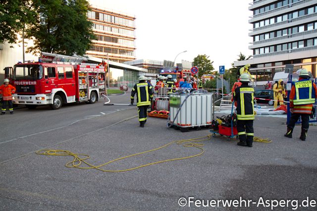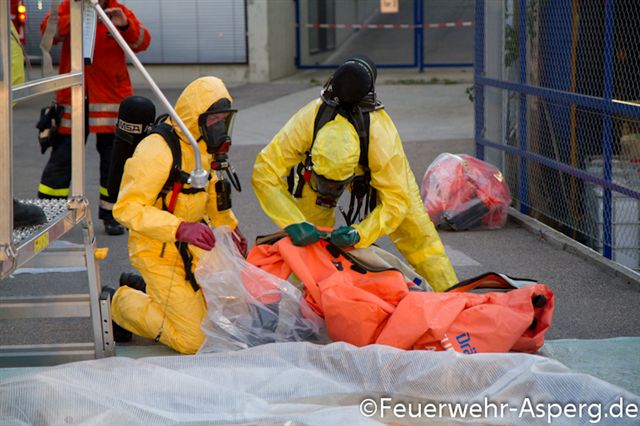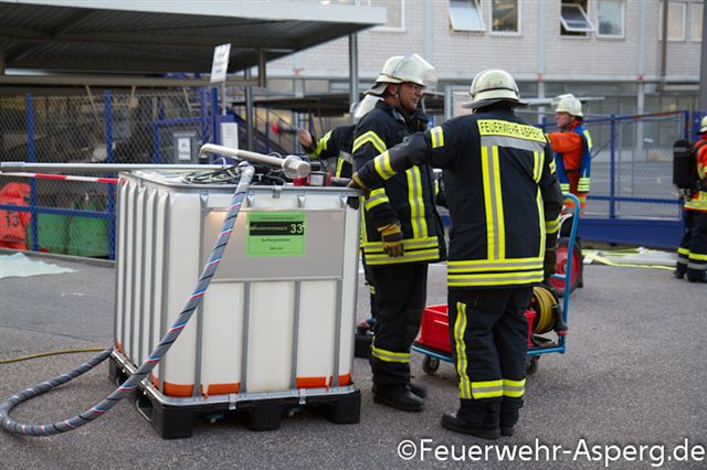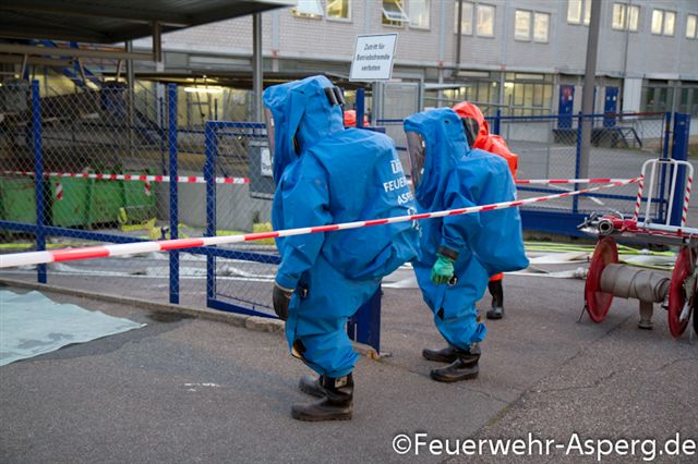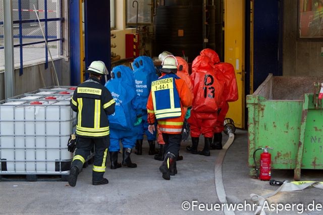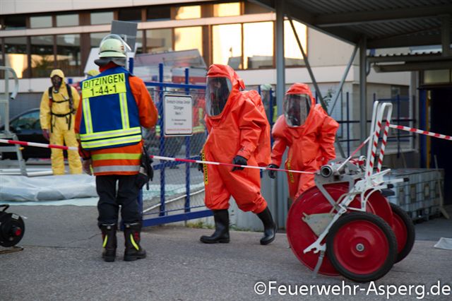 Am Freitag wurde die Feuerwehr Asperg mit dem Gefahrgutzug im Rahmen einer Überlandhilfe zu einem Gefahrguteinsatz nach Ditzingen alarmiert. Bei einem Verladevorgang in einer Firma in der Johann-Maus-Straße war ein 1000 Liter IBC-Behälter mit 53% Salpetersäure beschädigt worden. Rund 100 Liter der stark ätzenden Flüssigkeit waren beim Eintreffen der Feuerwehr bereits ausgelaufen. Umgehend wurde die bereits ausgelaufene Salpetersäure mit Chemikalienbindemittel abgestreut. Die Restmenge aus dem beschädigten IBC-Behälter wurde mittels einer speziellen Gefahrstoff – Fasspumpe in einen Ersatzbehälter umgepumpt. Bei dem Einsatz kamen mehrere Trupps unter schweren Chemikalienvollschutzanzügen zum Einsatz. Die Einsatzleitung wurde während des Einsatzes durch die Führungsgruppe Gerlingen-Ditzingen, einem Chemie Fachberater und dem Kreisbrandmeister unterstützt. Vor Ort waren auch der Rettungsdienst und die Polizei mit mehreren Fahrzeugen.