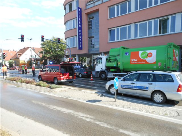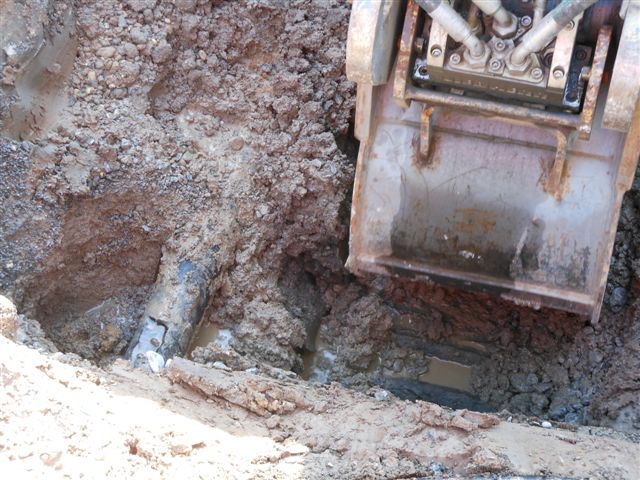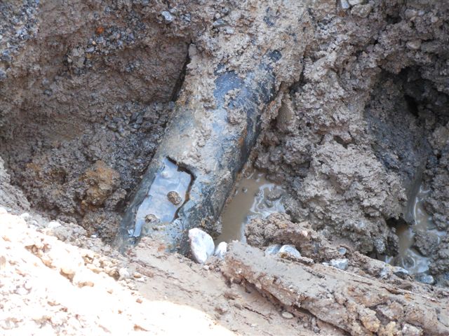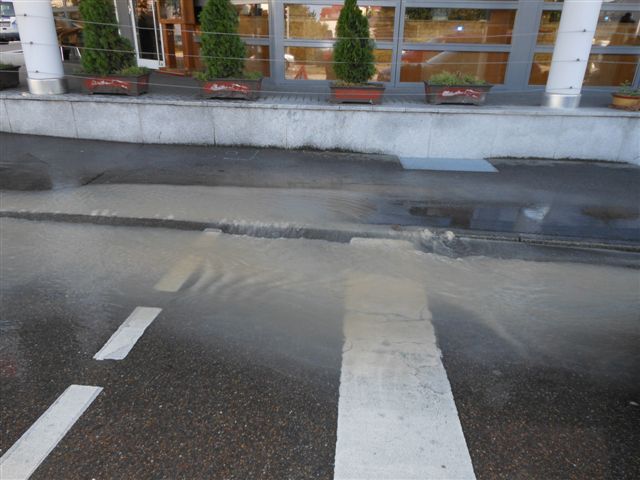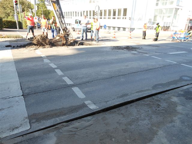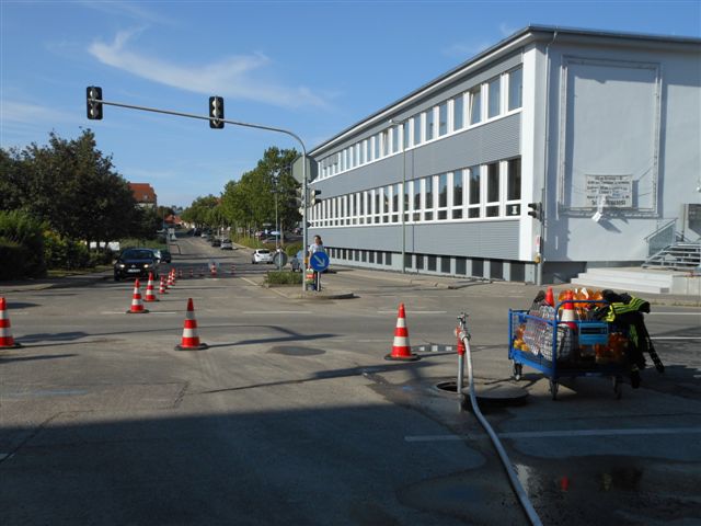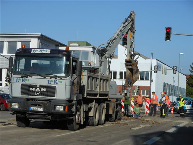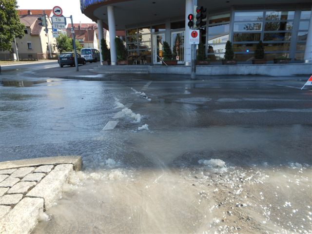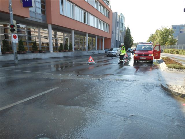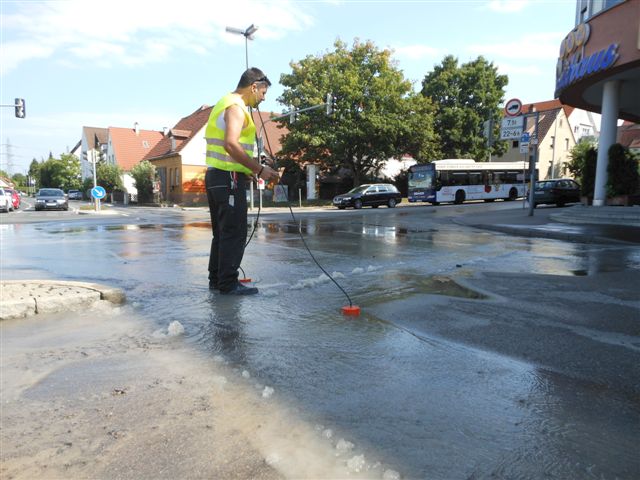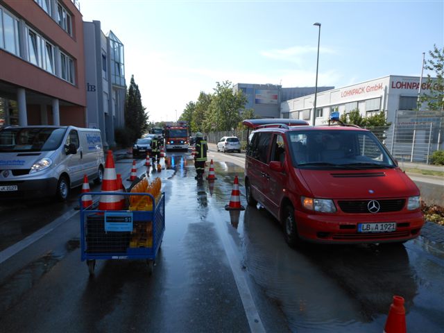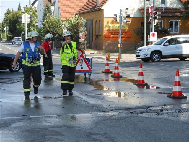 Fast Parallel zu der Alarmierung "Ölspur" in der Hirschbergstraße gingen über Notruf 112 die Meldungen eines Wasserrohrbruchs in der Eglosheimer Straße ein. Die Einsatzstelle "Eglosheimer Straße" wurde durch den Einsatzleiter der Feuerwehr Asperg angefahren. Nach erster Erkundung bestätigte sich die Meldung. Die Hauptwasserleitung der Stadt Asperg war geplatzt. Das unter hohem Druck austretende Wasser hatte die Straße bereits teilweise unterspült. Die Fahrbahndecke war über drei Fahrspuren abgesackt. Durch den Einsatzleiter wurde bedingt durch die zwei parallel laufenden Einsätze, Vollalarm für die Feuerwehr Asperg ausgelöst. Die kaputte Hauptwasserleitung wurde umgehend abgeschiebert. Die abgesackten und überfluteten Fahrbahnen mussten gesperrt werden. In Absprache mit  dem Ordnungsamt Asperg und der Polizei wurde eine Vollsperrung der Eglosheimer Straße in Fahrtrichtung Ludwigsburg eingerichtet. Hier kam zur Beschilderung der Umleitungen der städtische Bauhof zum Einsatz. Die Einsatzstelle wurde an die Stadtwerke Ludwigsburg übergeben. Diese begann umgehend mit den Reparaturmaßnahmen. Ein Bild von der Einsatzstelle vor Ort machte sich auch Bürgermeister Ulrich Storer, der Leiter der Stadtwerke Asperg Manfred Linder und der Haupt- und Ordnungsamtsleiter Volker Gramlich. Ebenfalls vor Ort war die Polizei mit zwei Streifen.