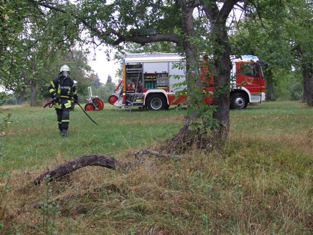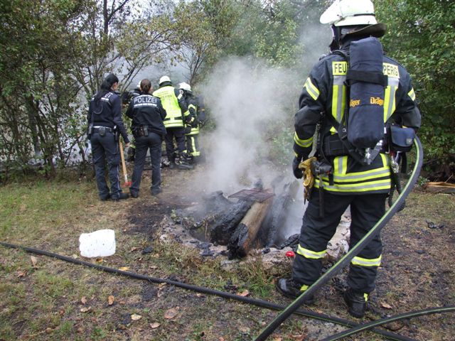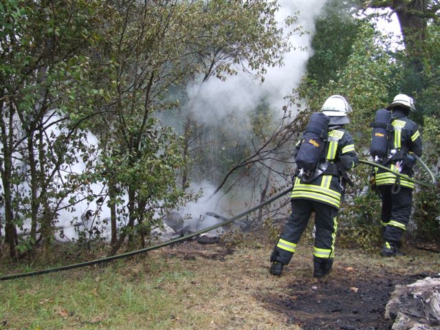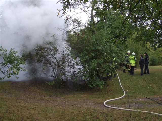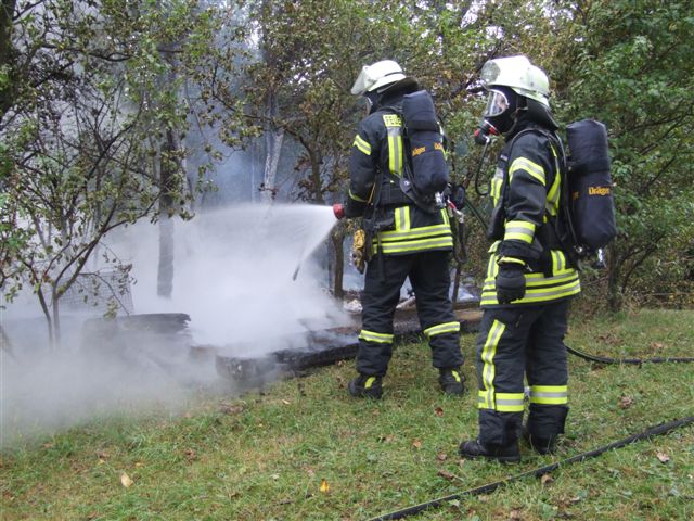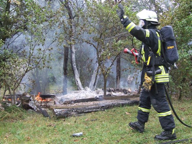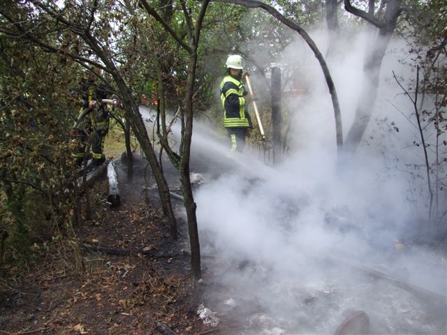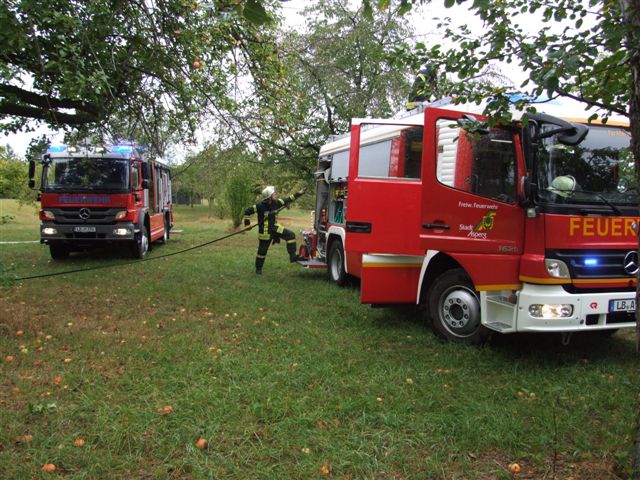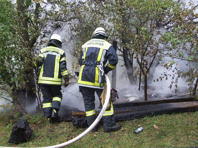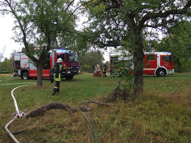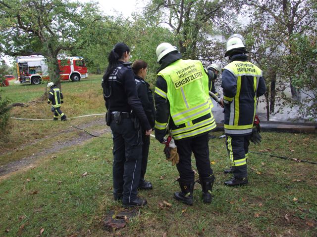 Während der Wachbereitschaft wurde die Feuerwehr Asperg zu einer brennenden Hecke in die Möglinger Straße in Fahrtrichtung zur Kreisstrasse K1693 alarmiert. Nach Erkundung durch die Feuerwehr Asperg stellte sich heraus, dass die Einsatzstelle auf der Gemarkung Möglingen lag. Ein Geräteschuppen auf einem Gartengrundstück war bereits vollständig niedergebrannt. Das Feuer hatte beim Eintreffen der Feuerwehr bereits auf zwei Bäume und eine Hecke übergegriffen. Sofort wurde die Feuerwehr Möglingen, die sich ebenfalls per Wachbereitschaft in ihrem Gerätehaus befand, nachalarmiert. Erste Löschmaßnahmen wurden von einem Trupp unter Atemschutz mittels Schnellangriff „Wasser“ durch die Besatzung des Hilfeleistungslöschfahrzeug Asperg eingeleitet. Nach Eintreffen der Feuerwehr Möglingen wurde ein weiteres C-Rohr zur Brandbekämpfung vorgenommen. Die Einsatzleitung wurde aufgrund der Zuständigkeit von der Feuerwehr Möglingen übernommen. Im weiteren Einsatzverlauf kam es zu umfangreichen Nachlöscharbeiten. Diese wurden durch die Kräfte der Feuerwehr Möglingen durchgeführt. Eine Polizeistreife vor Ort leitete Ermittlungen zum Brandhergang ein.