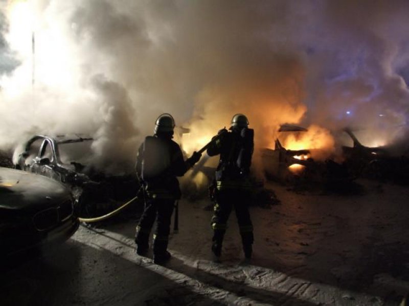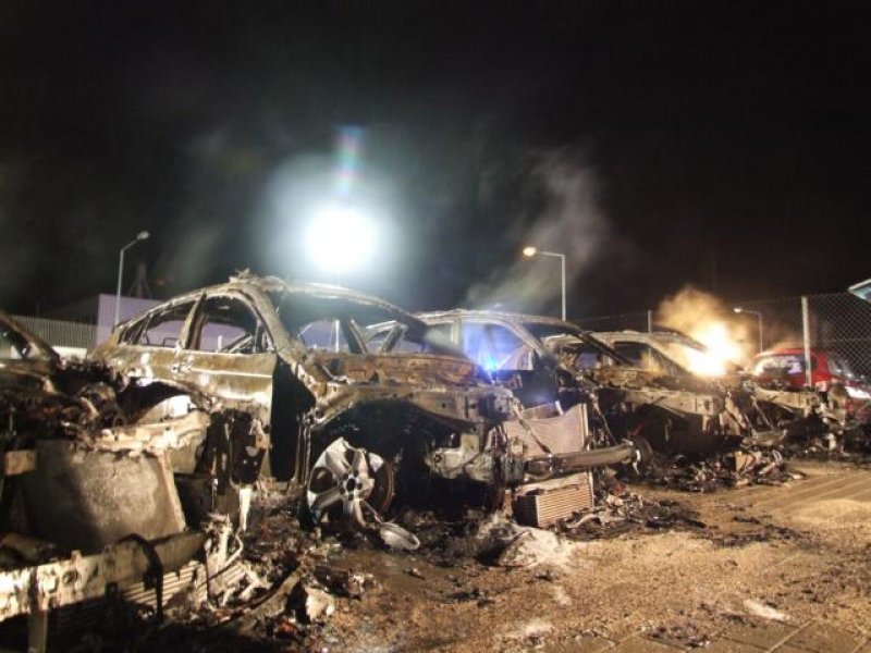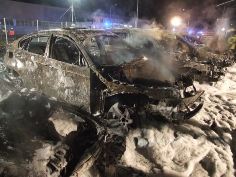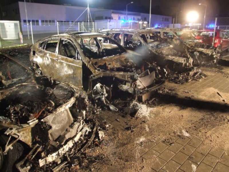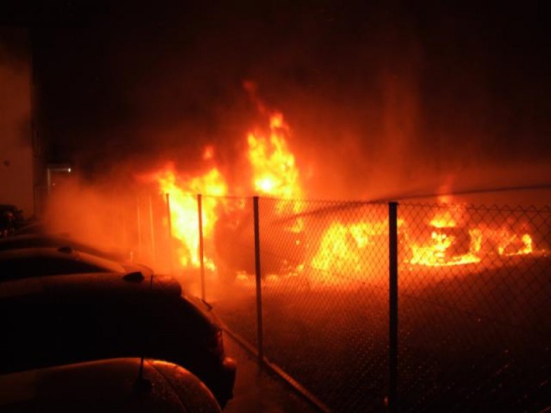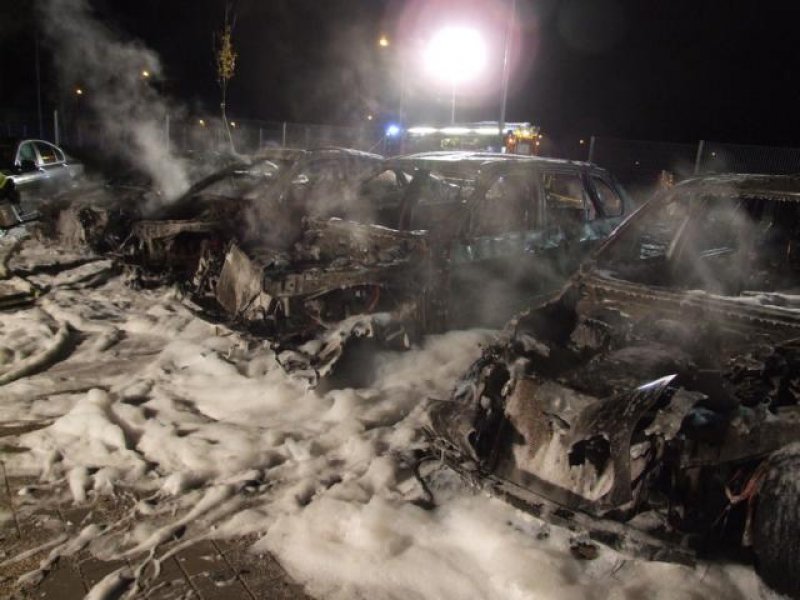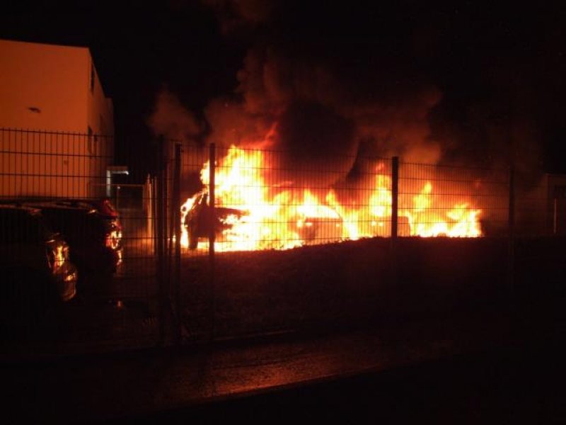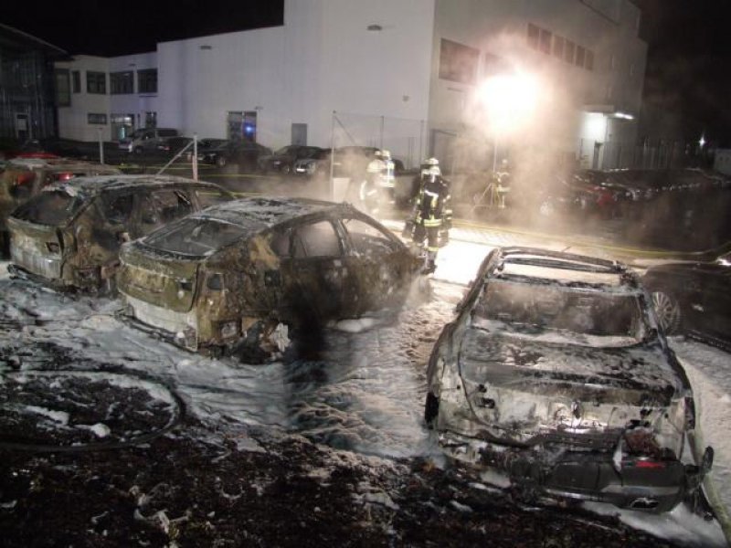 In der Nacht von Freitag auf Samstag wurde die Feuerwehr Asperg zu einem Autohaus in die Zeissstraße alarmiert. Bereits auf der Anfahrt war Feuerschein sichtbar. Beim Eintreffen der ersten Einsatzkräfte stellte sich heraus, dass auf dem Firmengelände bereits vier PKW im Vollbrand standen. Weitere Fahrzeuge waren aufgrund der enormen Hitzestrahlung gefährdet. Um auf das Firmengelände zu gelangen musste ein Zaunelement mittels Tigersäge entfernt werden. Umgehend wurde mit einer massiven Brandbekämpfung begonnen. Hier kamen insgesamt 4 Trupps unter schwerem Atemschutz mit zwei C-Rohren und zwei Schaumrohren zum Einsatz. Den Einsatzkräften der Feuerwehr Asperg gelang es eine Brandausbreitung auf weitere Fahrzeuge zu verhindern. Zur Absicherung vor Ort war der Rettungsdienst mit einem Fahrzeug. Da Brandstiftung nicht ausgeschlossen werden kann leitete die Kriminalpolizei Ermittlungen ein.