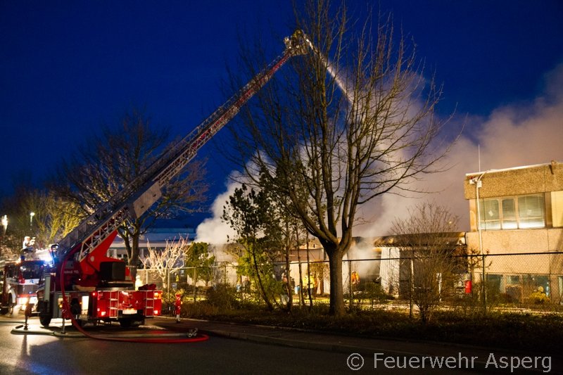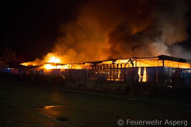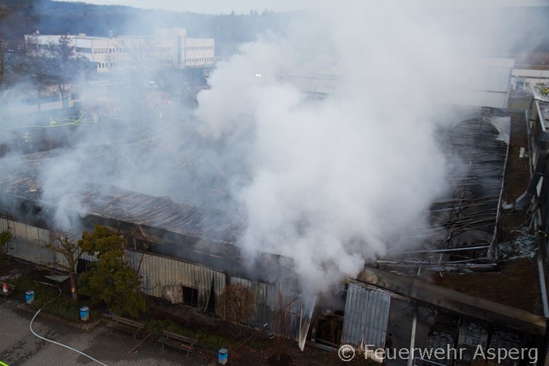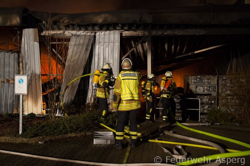 Am Samstag wurde die Feuerwehr Asperg im Rahmen der Überlandhilfe mit dem Hilfeleistungslöschfahrzeug zu einem Großbrand nach Bietigheim alarmiert. Eine Versand- und Lagerhalle, einer Firma in der Höpfigheimer Straße, stand auf eine Fläche von rund 2500m² im Vollbrand. Das Feuer drohte auf eine direkt angebaute Produktionshalle überzugreifen. Die Feuerwehr Asperg wurde von der Einsatzleitung dem Einsatzabschnitt 4 „Innenangriff Produktionshalle“ zugewiesen. Hier kamen insgesamt drei Trupps der Feuerwehr Asperg unter schwerem Atemschutz mit jeweils einem C-Rohr zum Einsatz. Ebenfalls kam die erst vor wenigen Tagen in Dienst genommene Wärmebildkamera zum Einsatz. Nur aufgrund eines massiven Löscheinsatzes aller beteiligten Feuerwehren konnte eine Brandausbreitung auf die Produktionshalle verhindert werden. Die Nachlöscharbeiten der Feuerwehr Bietigheim-Bissingen zogen sich bis in die Abendstunden. An der Versand- und Lagerhalle entstand Totalschaden. Die Kriminalpolizei leitete Ermittlungen zum Brandhergang ein. Insgesamt waren bei diesem Einsatz rund 140 Einsatzkräfte aus sieben Feuerwehren im Einsatz. Ebenfalls mit einem Großaufgebot vor Ort waren die Polizei und der Rettungsdienst.