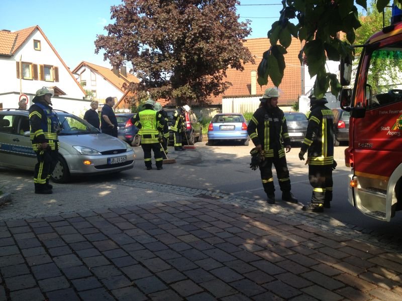 Gegen 17.00 Uhr wurde die Feuerwehr Asperg zum zweiten Mal an diesem Tag von der Leitstelle Ludwigsburg alarmiert. Über Notruf 112 wurde auslaufender Kraftstoff aus einem PKW gemeldet. Gemäß Alarm- und Ausrückeordnung rückte als erstes Fahrzeug der Gerätewagen Gefahrgut aus. Beim Eintreffen an der Einsatzstelle wurde umgehend ein Spezialauffangbehälter unter dem betroffenen PKW positioniert. Zwei Schachteinläufe in der unmittelbaren Nähe konnten durch die Feuerwehr noch rechtzeitig gesichert werden. Der bereits ausgelaufene Kraftstoff wurde mittels Bindemittel von den Einsatzkräften der Feuerwehr Asperg abgestreut. Vermutlich wurde der Unterboden des PKW , beim Überfahren eines Gegenstandes, beschädigt. die Polizei leitete zusammen mit der Ortspolizeibehörde Ermittlungen ein.