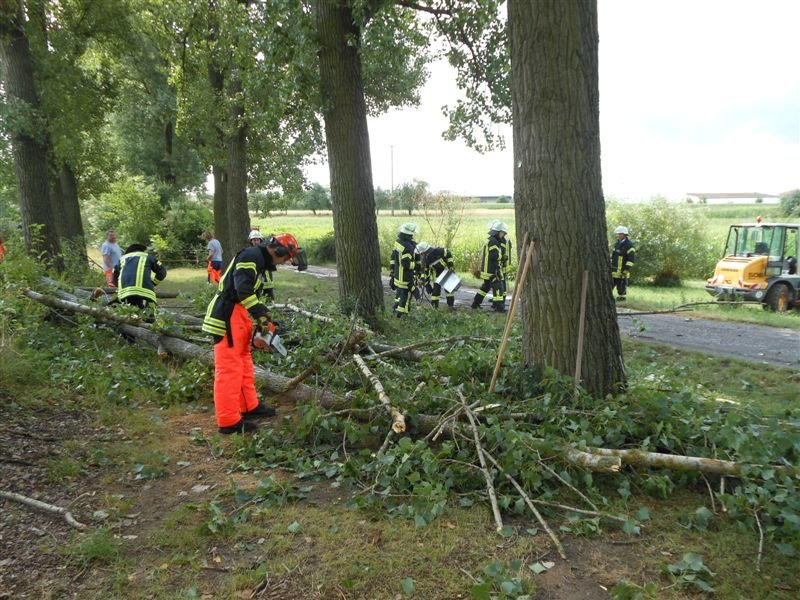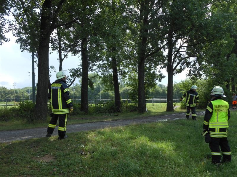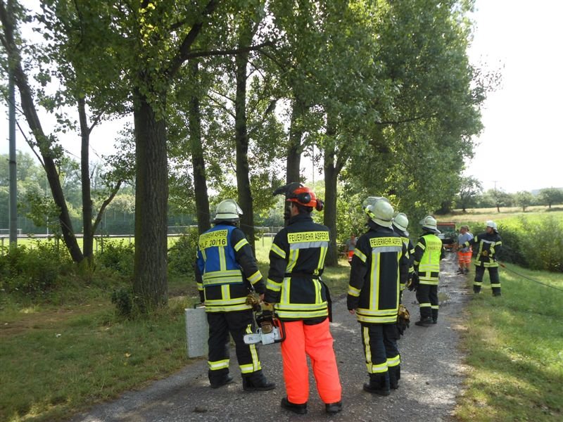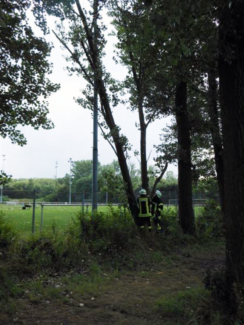 Im Rahmen einer Amtshilfe wurde die Feuerwehr Asperg gegen 11.00 Uhr von der Leitstelle Ludwigsburg ins „Osterholz“ alarmiert. Die städtischen Gärtner forderten die Feuerwehr Asperg zur Unterstützung bei der Bergung einer abgebrochenen Pappel an. Die Pappel war in der Mitte abgebrochen und hatte sich an einem Flutlichtmasten des Asperger Stadions verfangen. Versuche der städtischen Gärtner, das rund acht Meter große Baumstück umzuwerfen, scheiterten. Mittels Greifzug gelang es den Einsatzkräften der Feuerwehr letztendlich das abgebrochene Stück zu bergen. Der Windbruch wurde im Anschluss mittels Motorkettensäge durch die Feuerwehr zersägt und beseitigt.