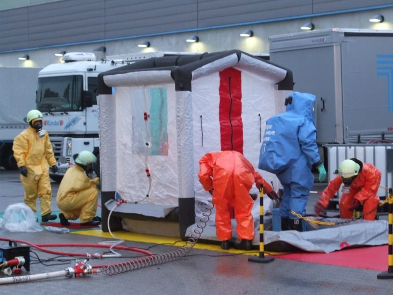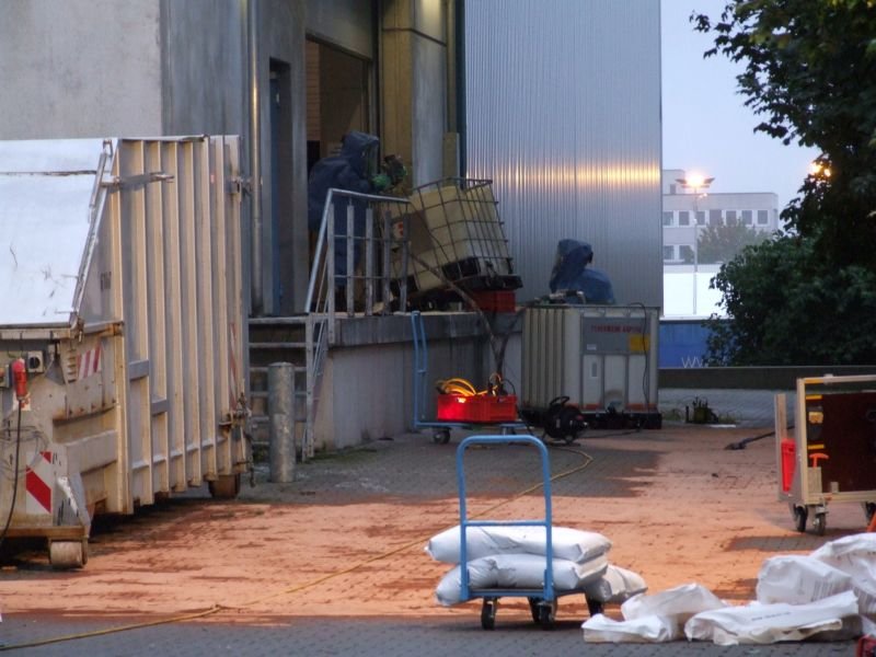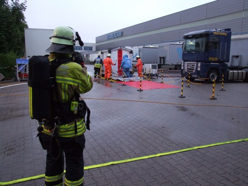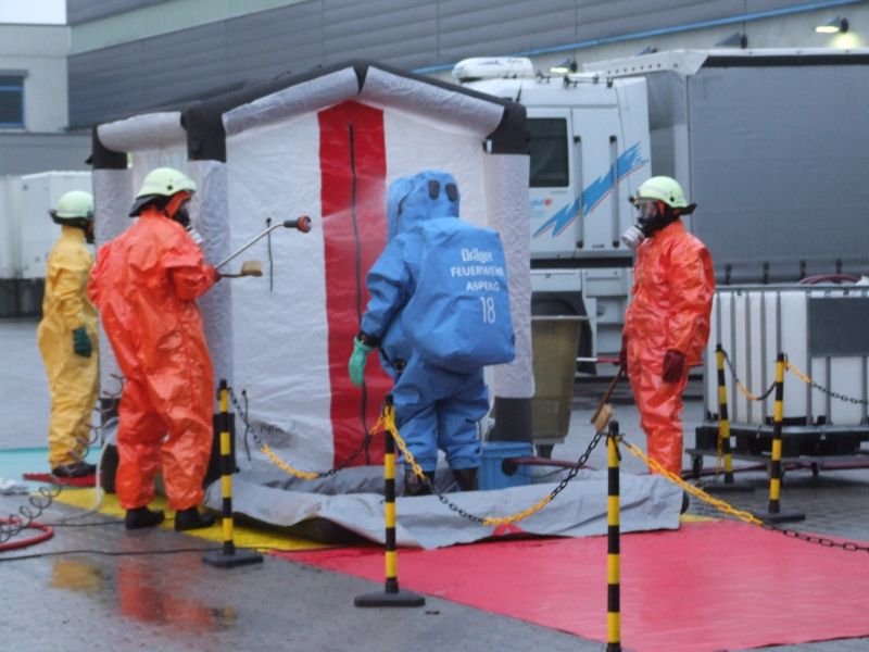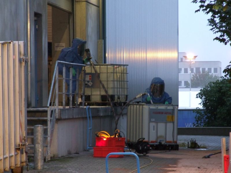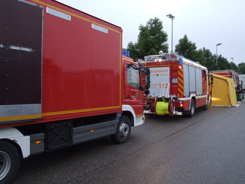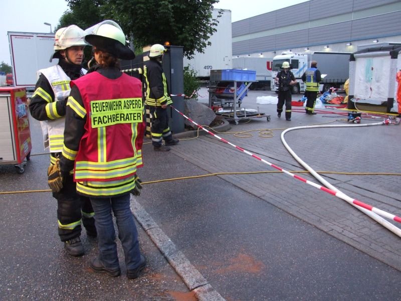 Am Montagmorgen wurde die Feuerwehr Asperg im Rahmen der Überlandhilfe mit dem Gefahrgutzug nach Schwieberdingen alarmiert. Bei einem Verladevorgang in einer Spedition in der Daimlerstraße wurde durch einen Gabelstapler ein 1000 Liter IBC-Behälter mit dem Gefahrstoff Mirecide-M/90.X beschädigt. Der stark ätzende und hoch umweltgefährdende Stoff lief aus einer Leckage aus. Den Einsatzkräften der Feuerwehr gelang es unter schweren Chemikalienvollschutzanzügen (CSA) die Leckage abzudichten. Parallel wurde das bereits ausgelaufene Medium mittels Chemikalienbindemittel abgestreut. Die Chemikalie wurde im weiteren Einsatzverlauf mit einer speziellen Gefahrgutfasspumpe in einen Ersatzauffangbehälter umgepumpt. Bei dem Einsatz kamen insgesamt 11 schwere Chemikalienschutzanzüge (CSA) zum Einsatz. Die umfangreichen Aufräumarbeiten mussten unter leichten Schutzanzügen und Filtermasken durchgeführt werden. Die Spedition wurde abschließend großflächig belüftet. Den Einsatzkräften gelang es eine größere drohende Umweltgefährdung abzuwenden. An der Einsatzstelle vor Ort war auch Kreisbrandmeister Andy Dorroch der über die komplette Einsatzdauer dem Einsatzleiter der Feuerwehr Schwieberdingen zur Seite stand. Ebenfalls vor Ort waren zwei Chemie Fachberater des Landkreises Ludwigsburg, sowie mehrer Polizeistreifen und der Rettungsdienst mit vier Fahrzeugen.