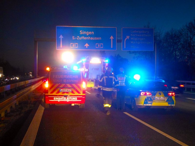 Am Mittwoch wurde die Feuerwehr Asperg gemäß Alarm- und Ausrückeordnung zusammen mit den Feuerwehren aus Möglingen und Ludwigsburg auf die Bundesautobahn A81 alarmiert. Auf dem Streckenabschnitt Ludwigsburg Nord in Fahrtrichtung Ludwigsburg Süd wurde ein Verkehrsunfall mit eingeklemmter Person über Notruf 112 gemeldet. Eine erste Erkundung an der Einsatzstelle ergab, dass drei Fahrzeuge an dem Verkehrsunfall beteiligt waren. Alle Fahrzeuginsassen konnten sich bis zum Eintreffen der Rettungskräfte selber aus den verunfallten Fahrzeugen befreien. Durch die Einsatzkräfte der Feuerwehr wurde umgehend der Brandschutz an der Unfallstelle sichergestellt und auslaufende Kraftstoffe mittels Bindemittel aufgenommen. An den verunfallten Fahrzeugen wurden die Batterien abgeklemmt. Zur Unfallaufnahme durch die Polizei wurde die Einsatzstelle durch die Feuerwehr ausgeleuchtet und die Fahrbahn abschließend gereinigt. Bei dem Unfall zog sich der Fahrer eines der Unfallfahrzeuge Verletzungen zu. Er wurde durch den Rettungsdienst, der mit zwei Fahrzeugen vor Ort war, zur weiteren Behandlung in ein Krankenhaus gebracht. Während des Einsatzes kam es zu erheblichen Verkehrsbehinderungen.