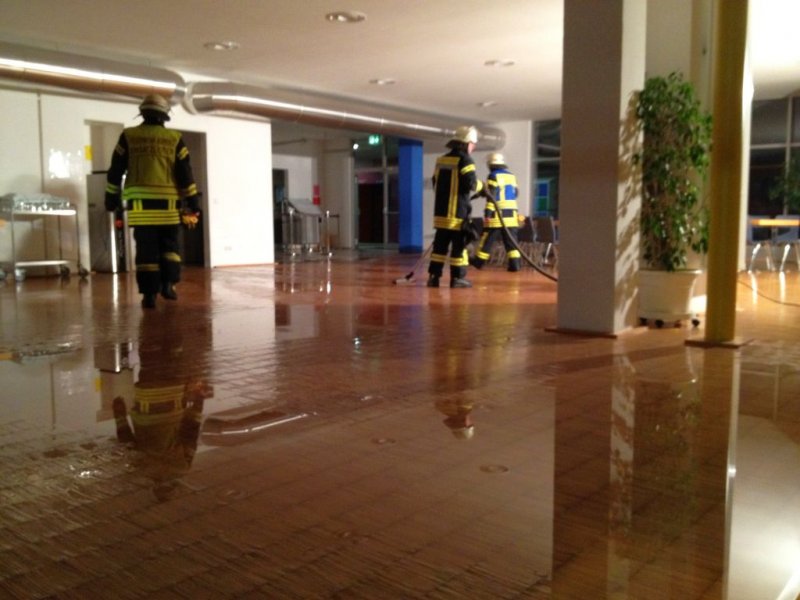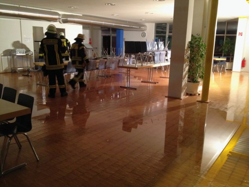 Am Silvesterabend wurde die Feuerwehr Asperg zum Friedrich-List-Gymnasium alarmiert. Der Hausmeister hatte bei einem abendlichen Kontrollgang einen Rohrbruch in einer Zwischendecke festgestellt und die Feuerwehr verständigt. Umgehend wurde die Hauptwasserzuleitung zum Gebäude abgestellt. Der Wasseraustritt in der Zwischendecke war so massiv, dass bereits ein Teil der Decke herabgestürzt war. Mit einer Plane wurde das aus der Decke laufende Wasser aufgefangen und kontrolliert in einen Ablauf eingeleitet. Das bereits ausgetretene Wasser erstrecke sich auf eine Fläche von rund 250 Quadratmeter im Bereich der Mensa. Das Wasser wurde mittels mehrerer Wassersauger durch die Einsatzkräfte der Feuerwehr aufgenommen. Im Bereich der Mensa kam es durch das Wasser zu erheblichen Beschädigungen. Ein Bild vor Ort machte sich Bürgermeister Storer.
