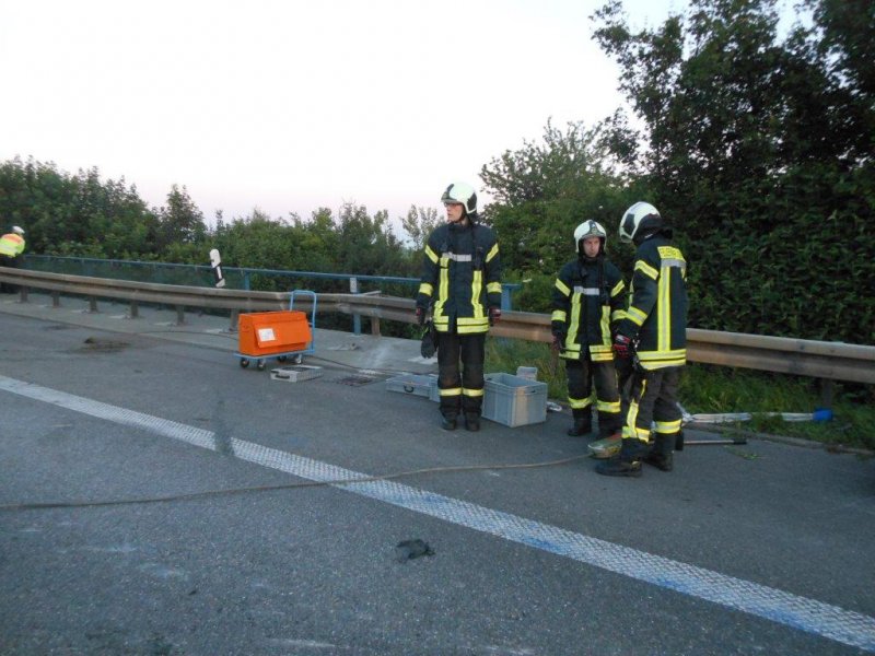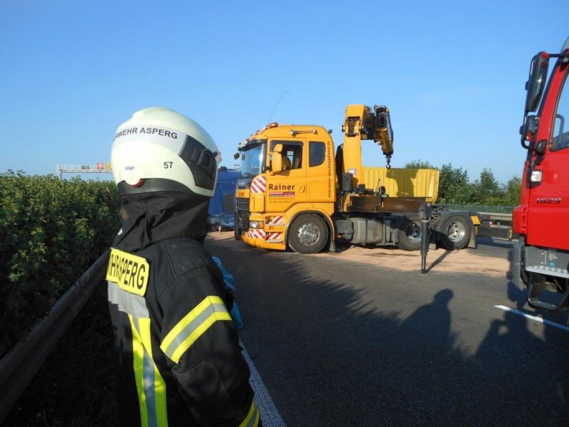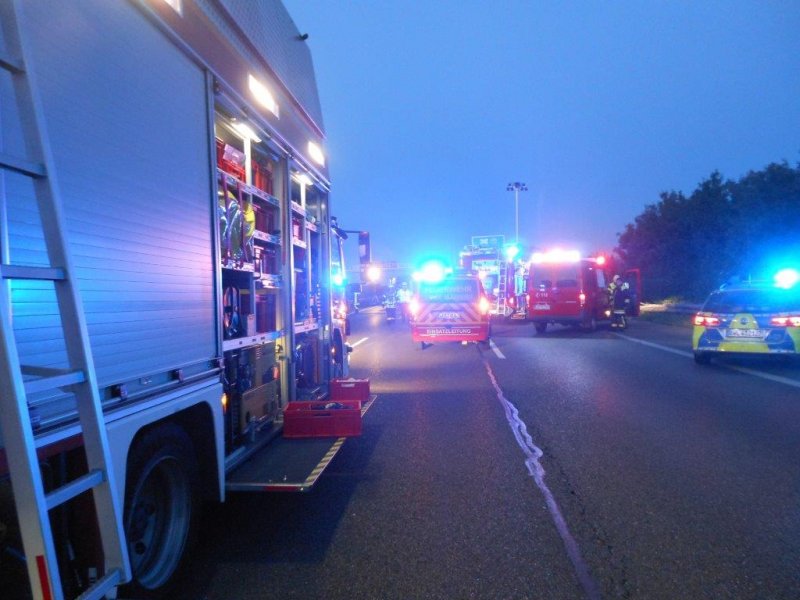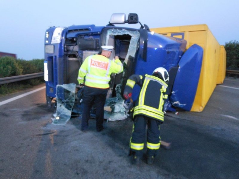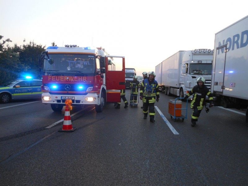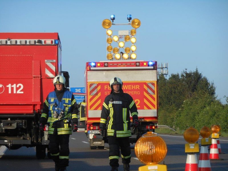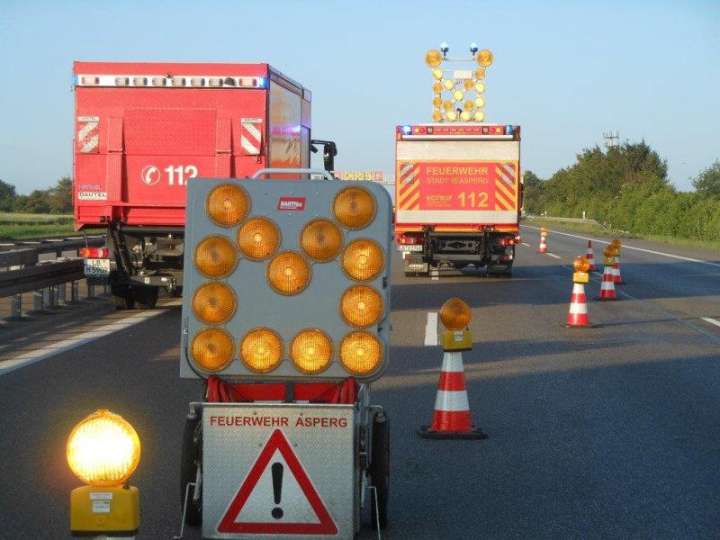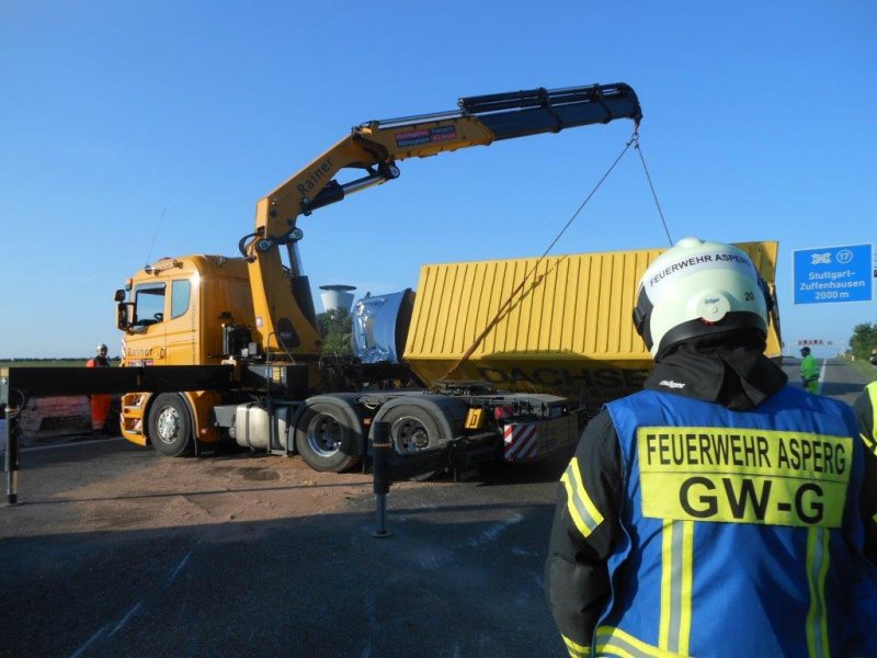 Zu auslaufenden Betriebsmitteln infolge eines Verkehrsunfalls wurden die Freiwilligen Feuerwehren Asperg und Möglingen um 04:27 Uhr auf die Bundesautobahn A81 alarmiert. Aus bislang unbekannter Ursache kam ein LKW-Fahrer mit seinem Fahrzeug, unmittelbar nach der Anschlussstelle Ludwigsburg-Süd in Fahrtrichtung Stuttgart, nach rechts von der Fahrbahn ab. Beim Versuch wieder auf die Fahrbahn zu gelangen übersteuerte er vermutlich sein Fahrzeug und prallte in die Mittelleitplanke. Durch den Aufprall kippte der 40 Tonnen schwere Gliederzug zur Seite und kam über alle drei Fahrstreifen liegend zum Stillstand. Der LKW-Fahrer erlitt hierbei leichte Verletzungen und wurde vom Rettungsdienst zur Beobachtung in ein Krankenhaus eingeliefert.