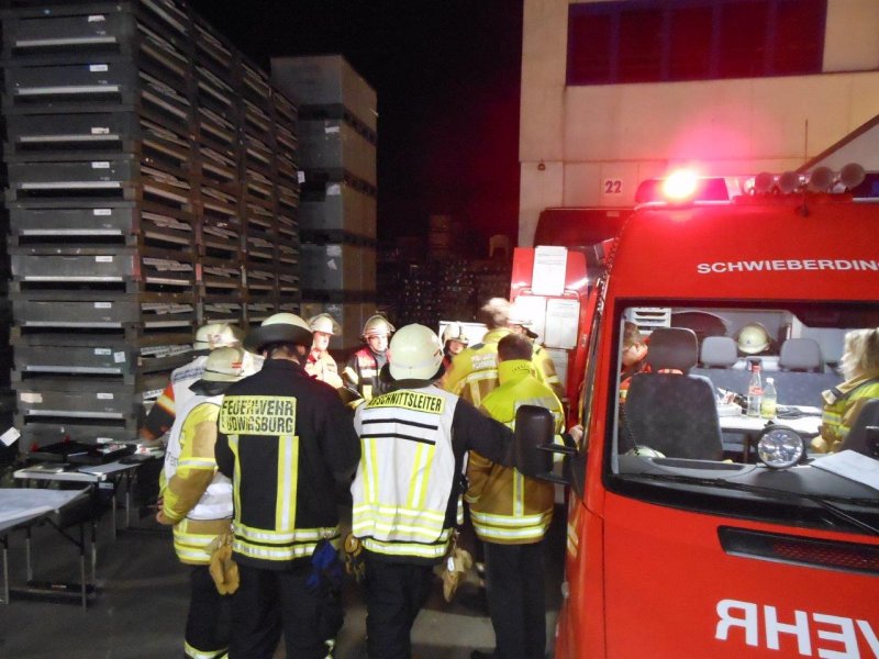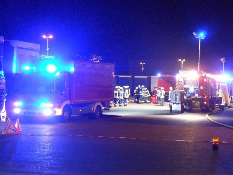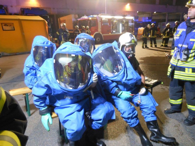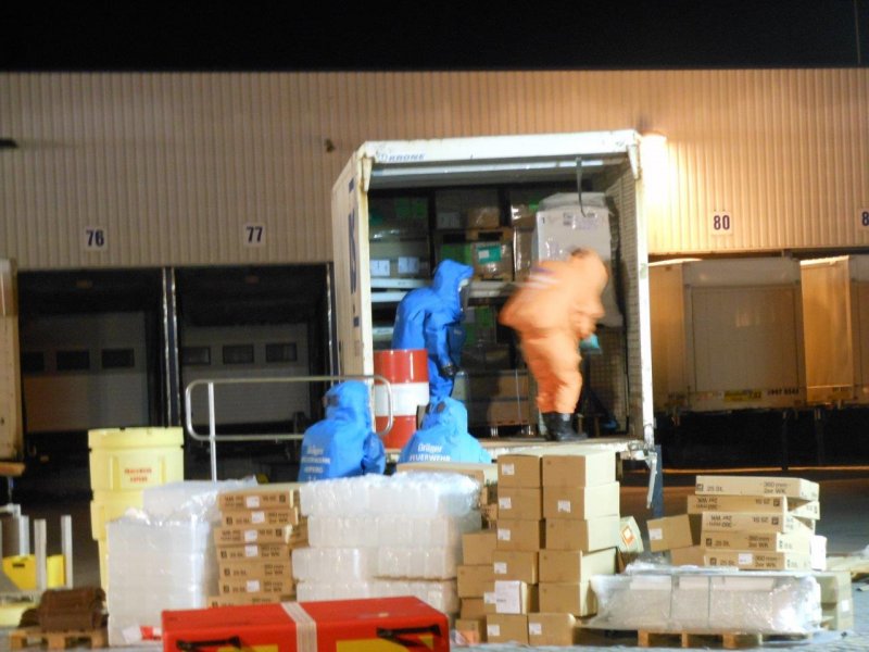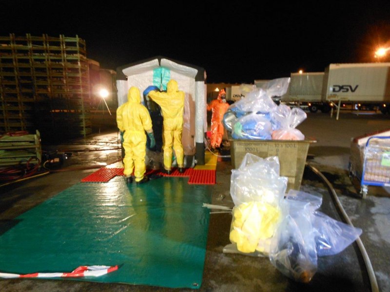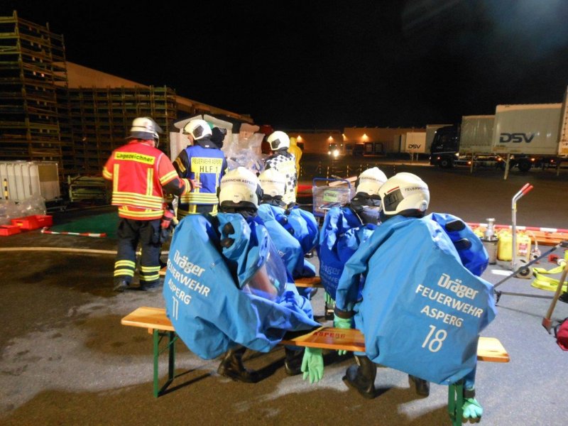 In der Nacht von Freitag auf Samstag wurde die Feuerwehr Asperg im Rahmen der Überlandhilfe mit dem Gefahrgutzug zu einer Spedition in die Markgröninger Straße in Schwieberdingen alarmiert. Aus einer Wechselbrücke lief Schwefelsäure aus verschiedenen Kleingebinden aus. Die mit Stückgut beladene Wechselbrücke musste unter schweren Chemikalienschutzanzügen komplett entladen werden. Die beschädigten Behältnisse wurden im weiteren Einsatzverlauf in Überfässern separiert. Das bereits ausgelaufene Medium wurde mittels Chemikalienbindemittel von den Einsatzkräften der Feuerwehr abgestreut. Der Einsatz zog sich über mehrere Stunden. Insgesamt kamen 19 Chemikalienvollschutzanzüge (CSA) in den Einsatz.