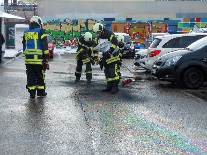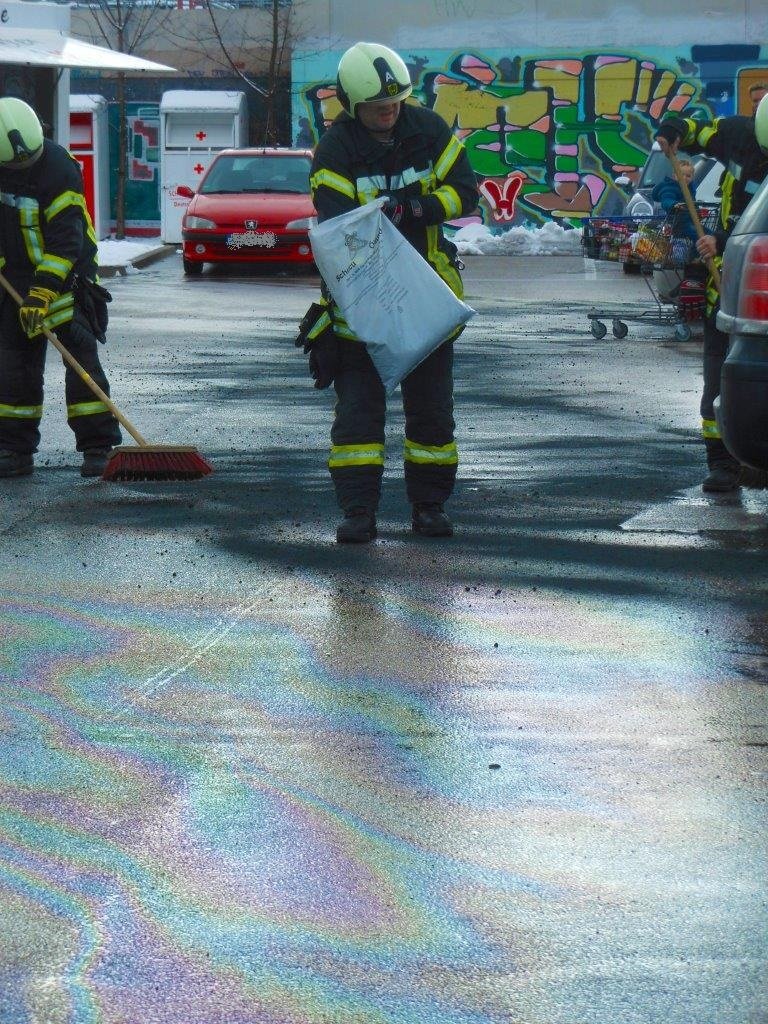 Kraftstoffspur im Bereich eines Einkaufszentrums in der Ruhrstraße. Der ausgelaufene Kraftstoff wurde durch die Einsatzkräfte der Feuerwehr mittels Ölbindemittel abgestreut.