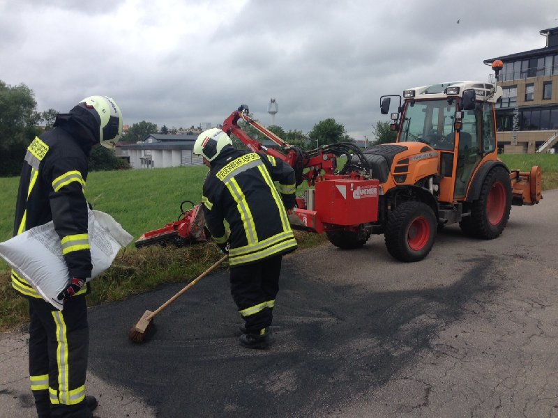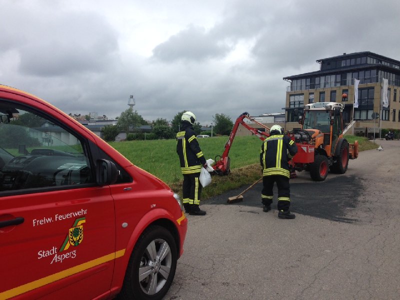Hydraulikschlauch an Fahrzeug geplatz. Das ausgelaufene Hydrauliköl wurde mittels Bindemittel durch die Einsatzkräfte der Feuerwehr abgestreut.