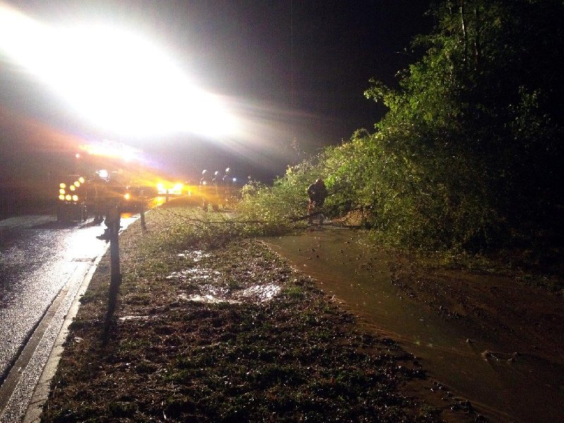 Aufgrund des Starkregens wurden teile der Fahrbahnböschung an der Ostumfahrung unterspühlt. Teile der Böschung rutschten auf einen Fahrradweg ab. Mehrere Bäume drohten dadurch auf die Fahrbahn zu stürzen.