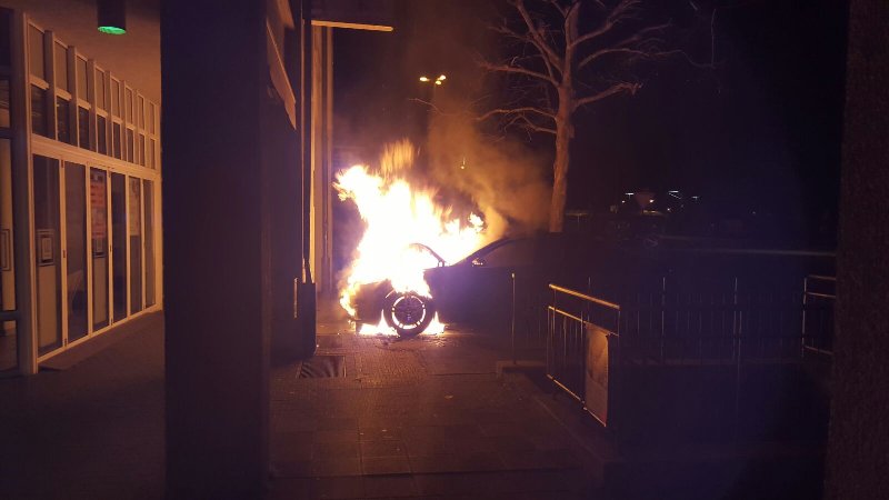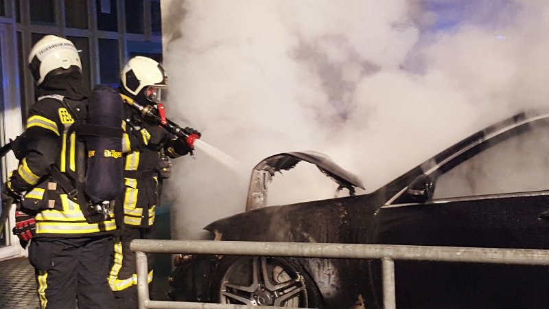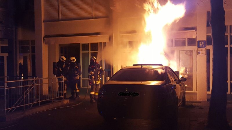 PKW-Brand mit Übergriff auf Mehrfamilienhaus. Wohnung im 3.OG durch offen gestandenes Fenster komplett verraucht.
