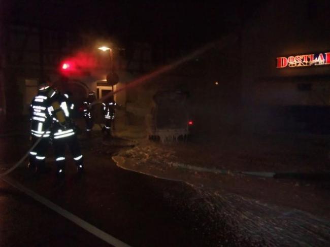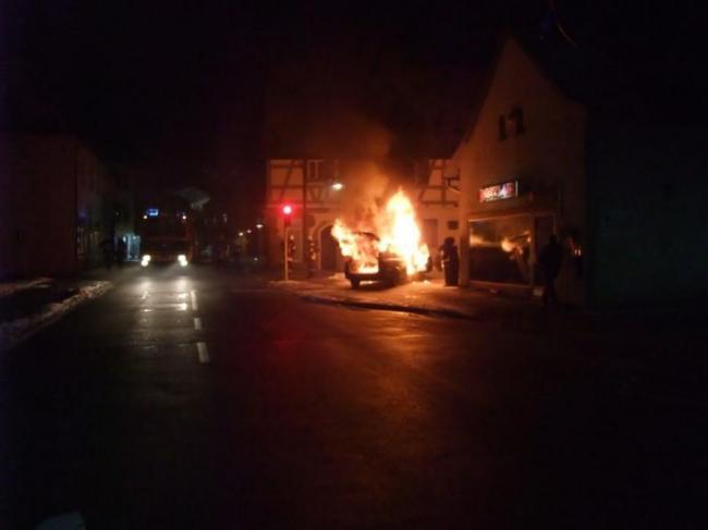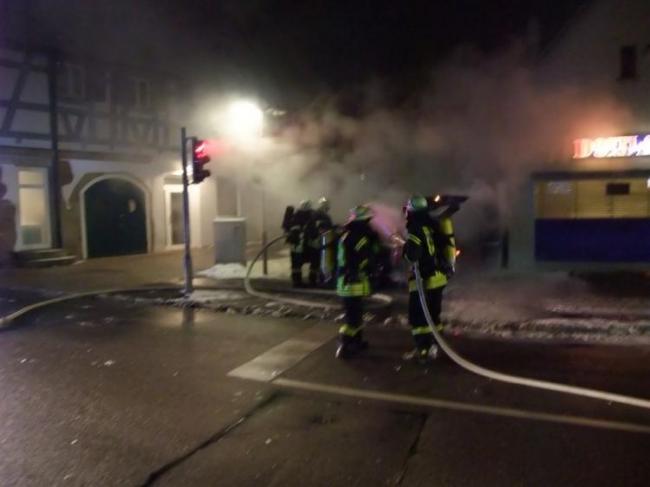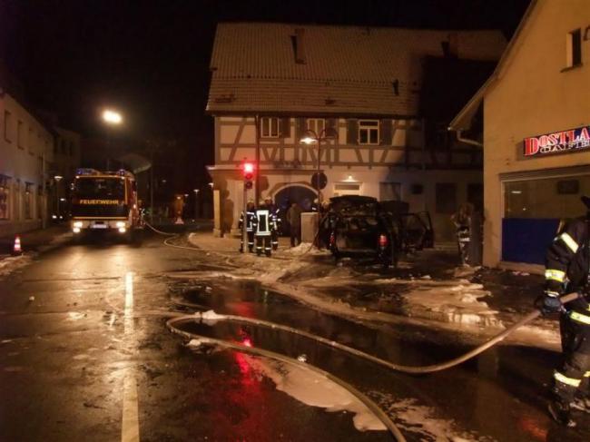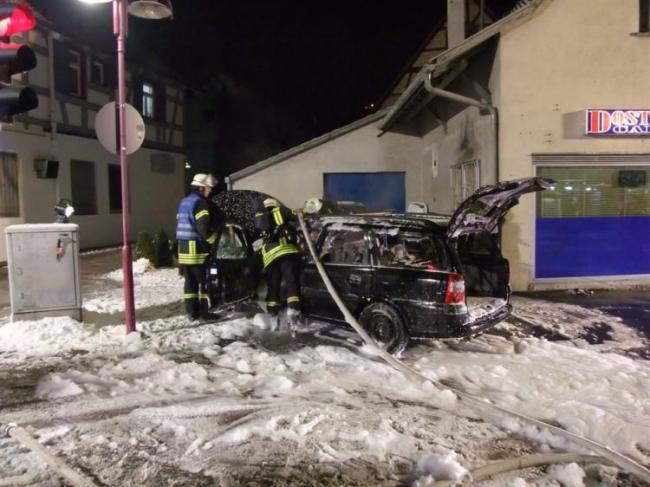 Am Mittwochabend wurde die Feuerwehr Asperg in die Bahnhofstraße Ecke Königstraße alarmiert. Über Notruf 112 wurde ein PKW–Brand gemeldet. Der Fahrer des betroffenen PKW bemerkte eine Rauchentwicklung aus dem Armaturenbrett, als er bei einer Rotphase an der Ampel stand. Ihm gelang es noch seinen PKW auf den Parkplatz einer Gaststätte zu fahren. Der Wirt der Gaststätte verständigte umgehend die Feuerwehr und versuchte mittels eines Pulverlöschers erste Löschversuche einzuleiten. Diese blieben jedoch ohne Erfolg. Beim Eintreffen der ersten Einsatzkräfte stand der PKW bereits im Vollbrand. Die Brandbekämpfung erfolgte umgehend durch einem Trupp unter schwerem Atemschutz mittels Schnellangriff „Schwerschaum“. Ein weiterer Trupp unter Atemschutz schützte mit einem zweiten Rohr die angrenzende Gaststätte vor dem Flammenüberschlag. Bereits nach wenigen Minuten konnte „Feuer aus“ gemeldet werden. Mit Hilfe des Gerätewagen Gefahrgut wurde die Einsatzstelle großflächig ausgeleuchtet. Eine Polizeistreife vor Ort leitete Ermittlungen zum Brandhergang ein. Aufgrund des gefrierenden Löschwassers wurde der städtische Bauhof zum Abstreuen der Einsatzstelle verständigt.