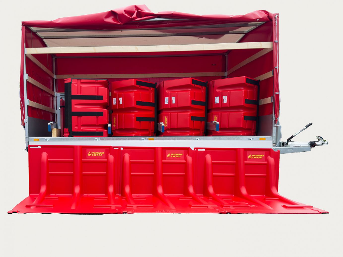 Auf dem Anhänger „Hochwasserschutz“ ist das mobile Hochwasserschutzsystem „NOAQ BOXWALL“ verlastet.