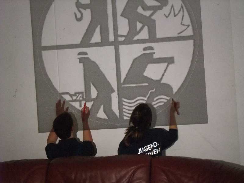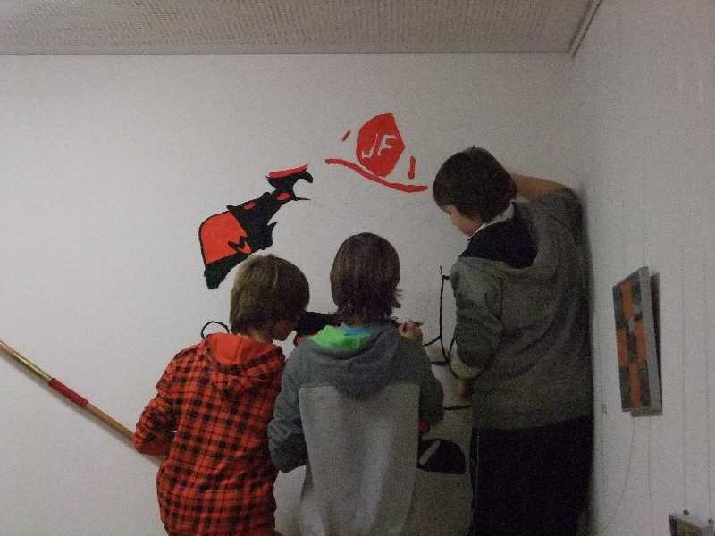 Bei den Bildern, die auf die Wand gemalt werden, wurde lange geschaut welche Bilder es sein sollen. Die Gruppe einigte sich dann auf eine Figur, die eine Feuerwehruniform an hat und einen Feuerwehrschlauch hält und das Signet, Retten- Löschen- Bergen- Schützen. Diese Bilder wurden genau so wie bei der JF- Flamme auch auf Folien gedruckt und an die Wand mit Bleistiften abgezeichnet.