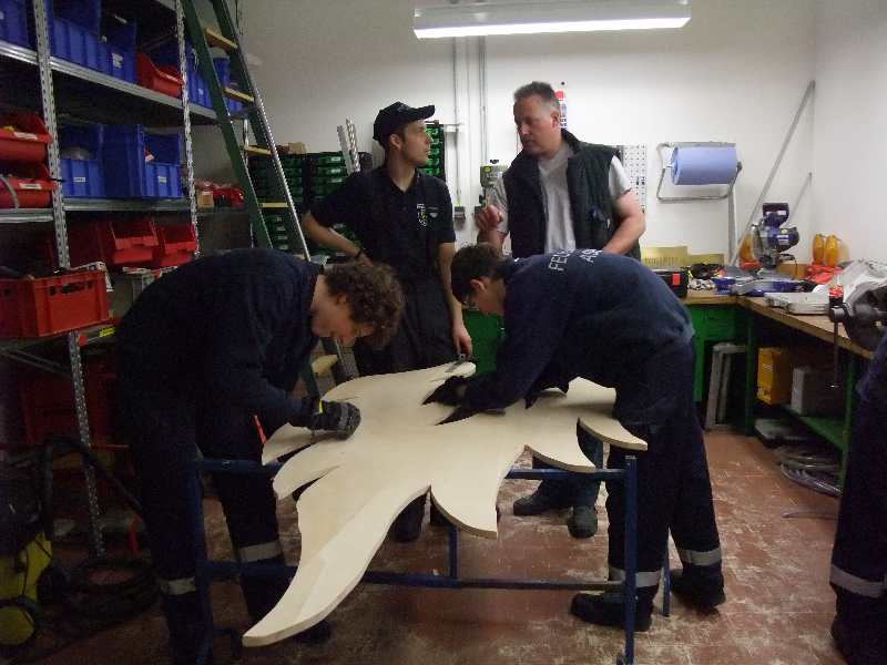 Für die JF Flamme aus Holz wurde nach einer passenden Flamme im Internet gesucht. Nachdem eine passende Flamme gefunden wurde, wurde diese auf eine Folie gedruckt. Mit Hilfe eines Tageslichtprojektors wurde die Flamme auf das Holz projiziert. Die Linien wurden von mehreren JF’ lern mit Bleistiften nach gezeichnet. Nachdem die Linien alle auf dem Holz waren, wurden die Flammen mit einer Säge ausgesägt.
