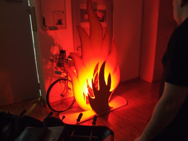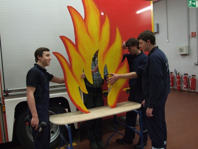 Schnell war klar, das Fahrzeug soll rot gestrichen werden und das Design eines Feuerwehrfahrzeuges haben. Mit roter Farbe wurde von uns der grüne Bollerwagen rot angestrichen. Zur selben Zeit wurden die Holzplatten zu Recht gesägt, damit die Außenwände etwas höher sind. Nachdem die Holzplatten fertig ausgesägt waren, wurden diese ebenfalls mit roter Farbe angestrichen. Für die Fenster entschieden wir uns, diese in grau zu malen. Das Stadtwappen bekommt seinen Platz auf der Rückseite unseres Fahrzeuges. Das Säge-Team war nach dem Seitenwände aussägen nicht arbeitslos sondern sägten an dem letztjährigen Projekt der Flamme weiter. Dazu befestigten sie noch rote Energiesparlampen, damit die Holzflamme auch leuchten kann.