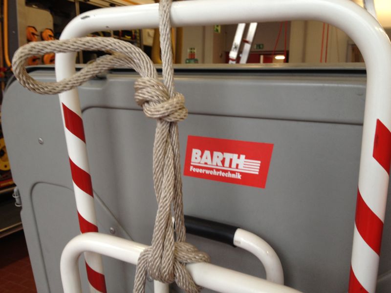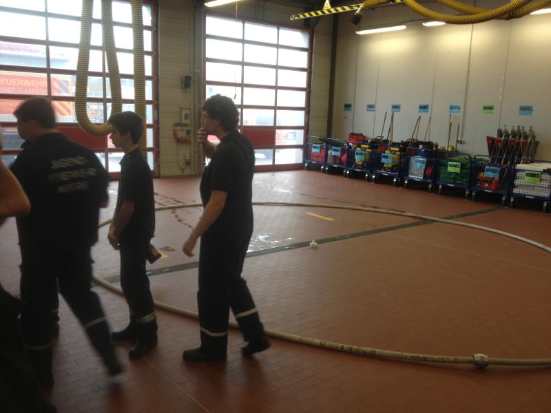 In der Gruppe Jugendflamme II wurde mit dem Thema Fahrzeugkunde begonnen. Da bei der geplanten Abnahme im Kreiszeltlager ein LF 16/12 oder ein LF 16 zur Verfügung stehen wird, wurde die Fahrzeugkunde an unserm Löschgruppenfahrzeug (LF) 16/12 durchgeführt. Dabei bekamen wir 10 Minuten Zeit, um uns den kompletten Inhalt des Fahrzeuges genauer an zu schauen. Nachdem die Zeit um war, wurden alle Tore der Geräteräume geschlossen und traten nochmals an. Jeder bekam einen anderen Buchstaben zu geteilt und musste dann ein Gerät aus dem Fahrzeug benennen. Beispielsweise wurde einem Jugendlichen der Buchstabe „B“ zugeteilt. Dieser antwortete dann mit dem Gerät „B-Feuerwehrschlauch“. Nachdem die Ausbilder bestätigten, dass es dieses Teil auf dem Fahrzeug gibt, musste der B-Feuerwehrschlauch aus dem Fahrzeug geholt werden. Danach musste das Teil der kompletten Gruppe erklärt werden, wofür es benötigt wird. Hier wäre jetzt die Antwort „für die Wasserbeförderung“ richtig gewesen. Nach dem diese Aufgabe fünf Mal widerholt wurde mit jeweils anderen Buchstaben, wurde das nächste Thema in Angriff genommen. Jetzt wurde das richtige Absichern einer Unfallstelle geprobt. Als erstes bekamen wir in der Theorie erklärt, wie eine Unfallstelle richtig auf einer Straße abgesichert wird. Dazu werden Pylonen und Faltsignale mit Warnleuchten in bestimmten Abständen aufgestellt. Um diese Aufgabe gut zu üben, fuhren wir mit dem Kleineinsatzfahrzeug (Kef) in die Straße „Im Überrück“. Diese ist lang und Verkehrsberuhig –kurz gesagt, ideal um eine Straßensperrung zu üben. 50 Meter vor und hinter dem Kef wurden die Pylonen so aufgestellt, dass die Autofahrer auf die Gegenspur geleitet werden. In einer Entfernung von etwa 100 Metern des Kef’s wurden die Faltsignale mit Warnleuchten aufgestellt, um die Verkehrsteilnehmer vor geänderter Verkehrsführung zu warnen. Nach dem alle Pylonen richtig standen, sahen wir, dass wir unsere Straßensperrung richtig aufgebaut hatten. Denn ein Autofahrer fuhr wie aus Zufall kurz vor dem Abbau die Straßensperrung entlang. Nach dem Aufräumen der Straßenabsicherung fuhren wir wieder zur Wache zurück und übten die Knoten.