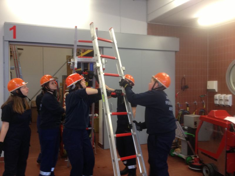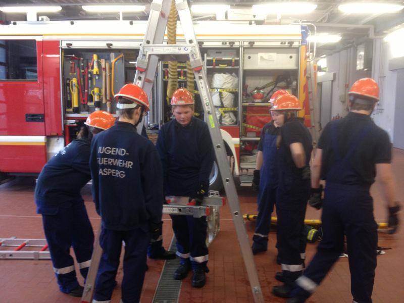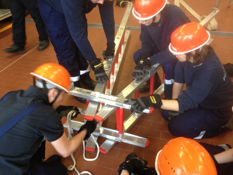 Die erste Gruppe an dieser Station baute aus zwei Steckleiterteile und einem Steckverbinder den ersten Teil der Schaukel. Nach langem Versuchen die zwei anderen Steckleiterteile mit dem Anfangsstück der Steckleiter mit Knoten zu verbinden scheiterte. Dafür probierten wir es mit einer sogenannten Rettungsplattform. Diese bauten wir als zweites Seitenteil unserer selbst gebastelten Schaukel auf. Die Verbindung der Plattform und der Leiter erfolgte über ein drittes Steckleiterteil. Die Leiter wurde mit vielen Mastwürfen gesichert. Ein B-Schlauch war der Sitz und das Seil zu gleich. Jetzt wurde die erste Sitzprobe unternommen. Unser leichtester Jugendlicher aus der Gruppe testete, ob die Schaukel hält. Nach großer Anspannung und bestandenem Funktionstest, trauten sich auch unsere Ausbilder die Schaukel zu testen. Am Ende hatten sowohl Ausbilder als auch wir Jugendliche unseren Spaß zu schaukeln. Damit beide Gruppen die Stationen tauschen konnten, musste die Schaukel wieder abgebaut werden. Damit die zweite Gruppe das Ergebnis nicht sehen konnte, wurden alle Teile bis auf die Leiter im Fahrzeug wieder aufgeräumt.
