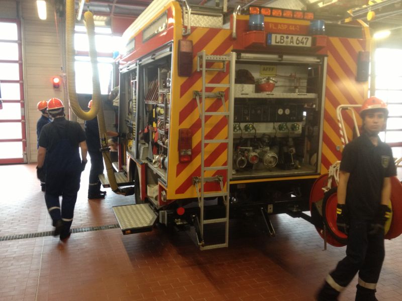 Jetzt hieß es für beide Gruppen alles aufräumen. Denn das Mittagessen war fertig. Schnell wurden Teller und Besteck gedeckt, bevor die leckeren roten Würste und das Fleisch mit Brötchen und Kartoffelsalat verspeist wurden. Jeder genoss das leckere Essen und die wohl verdiente Pause vor dem zweiten Teil des Tages. Nach der Pause trafen wir uns wieder in der Fahrzeughalle zum Antreten. Wie am Morgen auch, wurden wir in zwei Gruppen aufgeteilt. Der einzige Unterschied war nur, dass die Gruppen neu gemischt wurden. Die neue Aufgabe war, Knobelaufgaben nur mit Hilfe der Materialien aus den beiden Löschfahrzeugen zu lösen.