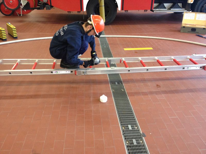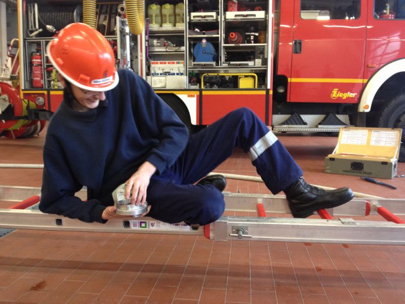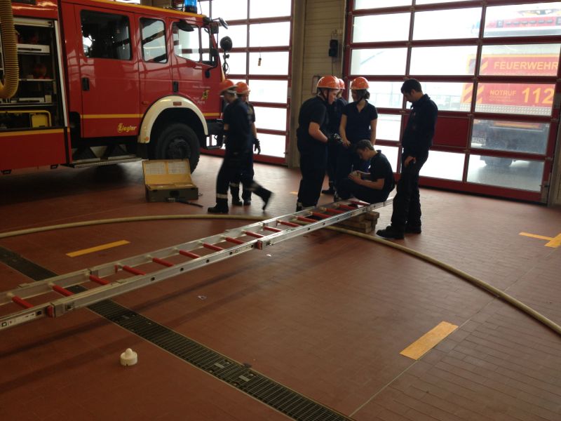 Für diese Knobelaufgabe bekamen wir das Hilfeleistungslöschfahrzeug (HLF) zur Verfügung gestellt. Da wir auf jeden Fall eine Leiter für diese Aufgabe benötigten, holte der Maschinist die Steckleiter vom Fahrzeugdach. Jetzt galt es, mit Hilfe der vier Leiterteile und den Geräten des HLF’s eine Schaukel zu bauen, die am Ende einen Ausbilder aushalten muss. Gemeinsam im Team wurden Geräte überlegt, mit denen eine Person am Ende schaukeln kann. Sehr viele Ideen konnten dann leider nicht verwirklicht werden, da sie für die große Last nicht vorgesehen sind.