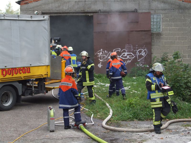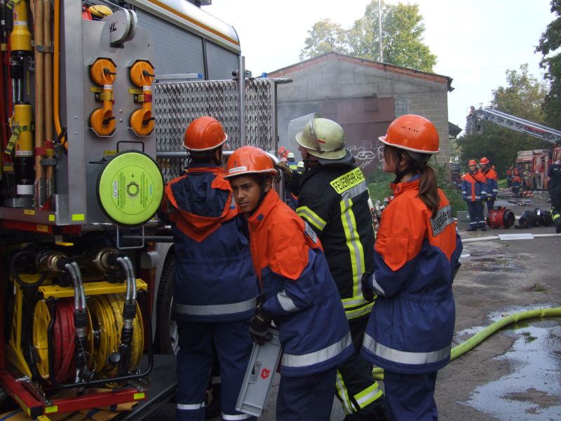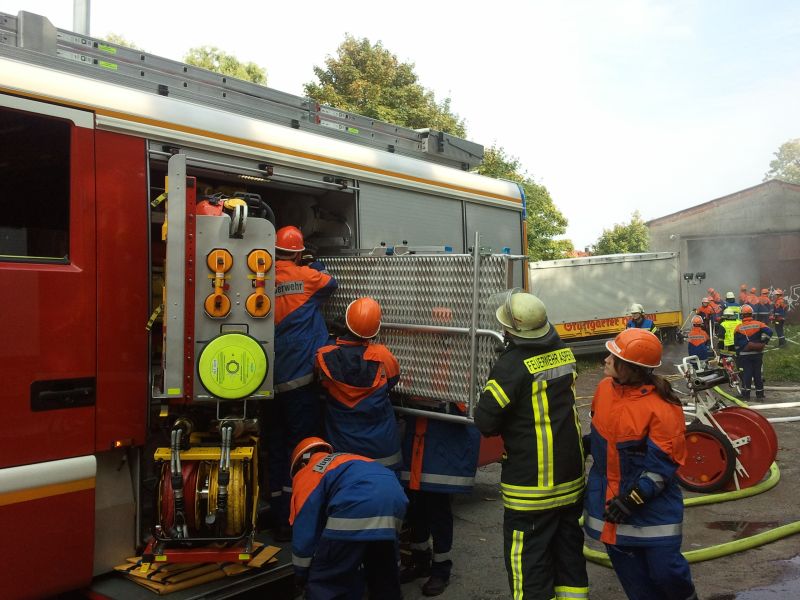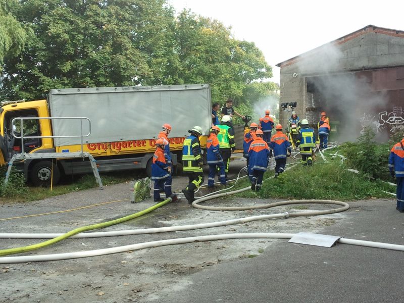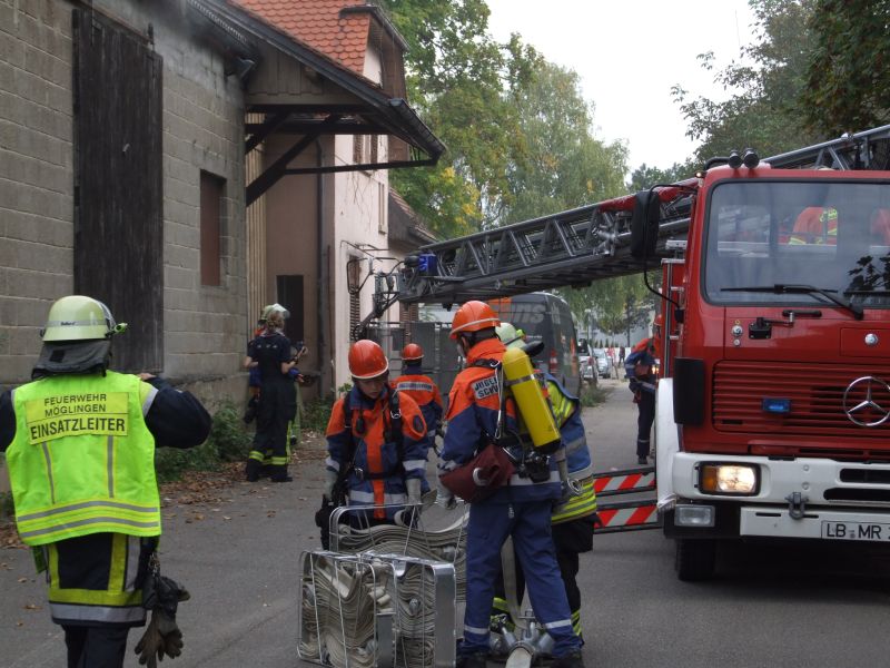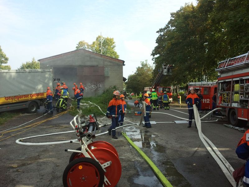 Die Übung begann um 15:00 Uhr am Bahnhof in Möglingen. Gegeben war das Szenario eines Brandes in einem Fabrikgebäude. Die Besitzerin der Anlage versuchte noch ihren LKW aus den Flammen zu retten, jedoch wurde sie dabei ohnmächtig und verunglückte kurz darauf mit ihrem Fahrzeug.