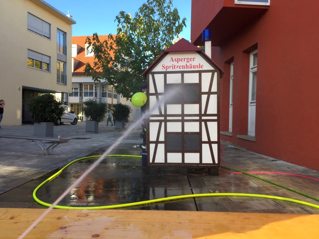 Bereits zum zweiten Mal nahm die Jugendfeuerwehr an der Asperger Kirbe teil und stellte das bekannte Asperger Spritzenhäusle. Trotz großem Angebot für Kinder, wie mehrere Hüpfburgen und Stefino, welcher auf Stelzen als Ballonkünstler auftrat, kam es immer wieder zu einer Schlange am Spritzenhäusle.