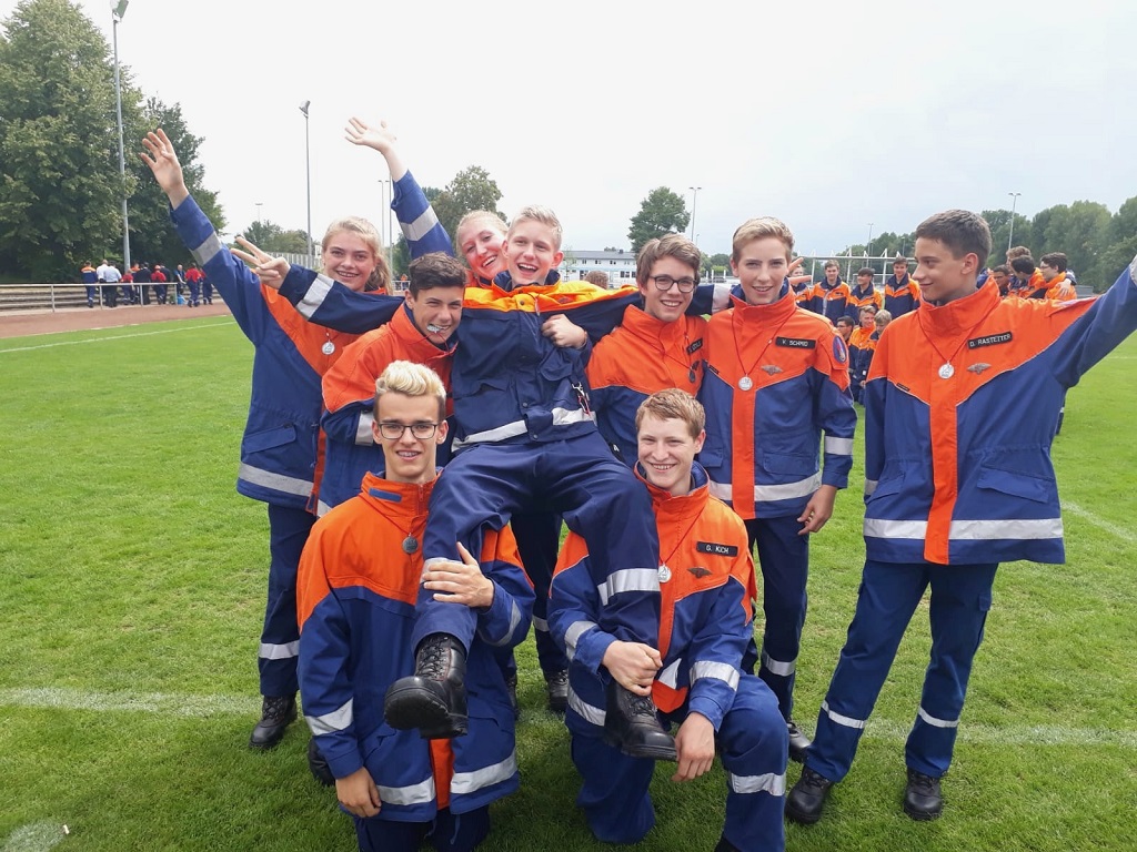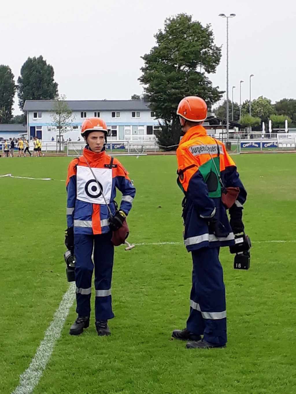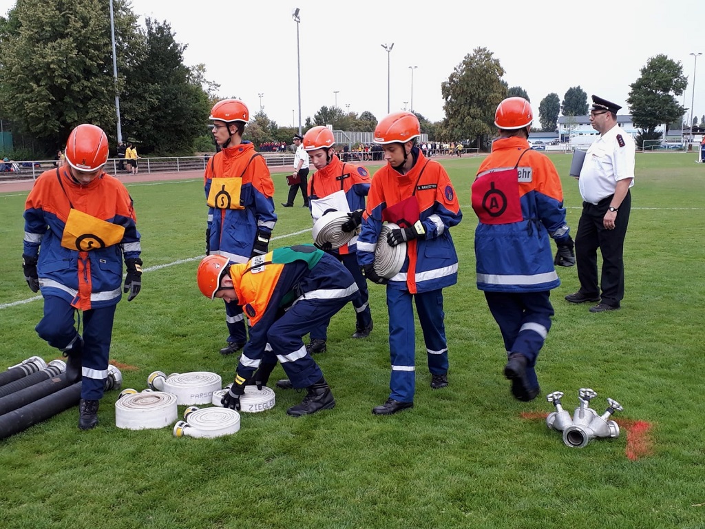 Die Leistungsspange wird von Wertungsrichtern mit 0-4 Punkten bewertet. Unsere Gruppe begann mit der schwierigsten Disziplin, der Schnelligkeitsübung, die wir mit 3 Punkten schafften. Bei dieser Übung müssen 8 Schläuche perfekt aneinandergekuppelt werden und die Gruppe muss ganz am Ende der Schläuche antreten. Dafür hat die Gruppe höchstens 75 Sekunden Zeit und es dürfen sich keine Verdrehungen im Schlauch befinden. Anschließend kamen der Löschangriff, eine Fragenbeantwortung mit Fragen über politische, aktuelle und feuerwehrtechnische Themen, ein Staffellauf mit 1500m und Kugelstoßen mit einer gesamten Mindestweite von 55m. Außerdem wurde der Gesamteindruck der Gruppe bewertet. Hierzu zählt respektvoller Umgang miteinander, Disziplin, angemessenes Verhalten und Kameradschaft. Die Verleihung der Leistungsspange fand um 16 Uhr statt.